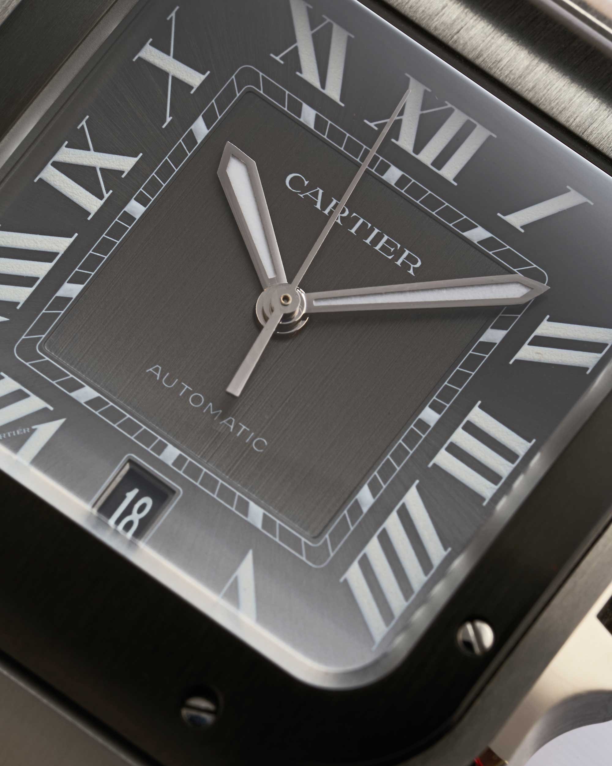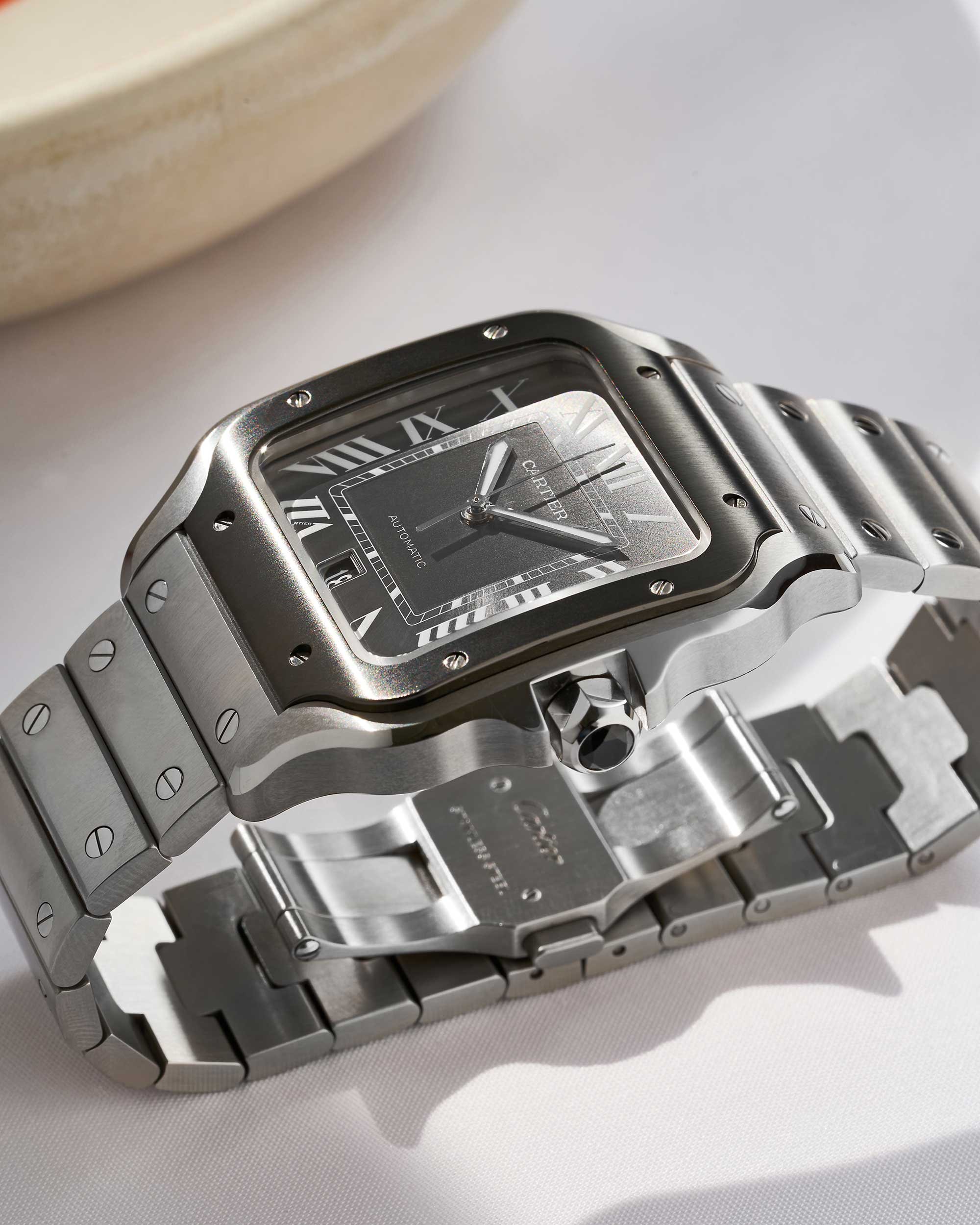 Die Cartier Santos Großes Modell mit der Referenz WSSA0037 verfügt über ein Edelstahlgehäuse mit den charakteristischen, sichtbar verschraubten Bandanstößen und der markanten Santos-Lünette. Das kantige Design mit abgerundeten Kanten steht für die ikonische Santos-Form, die seit über einem Jahrhundert ein fester Bestandteil der Cartier-Kollektion ist.