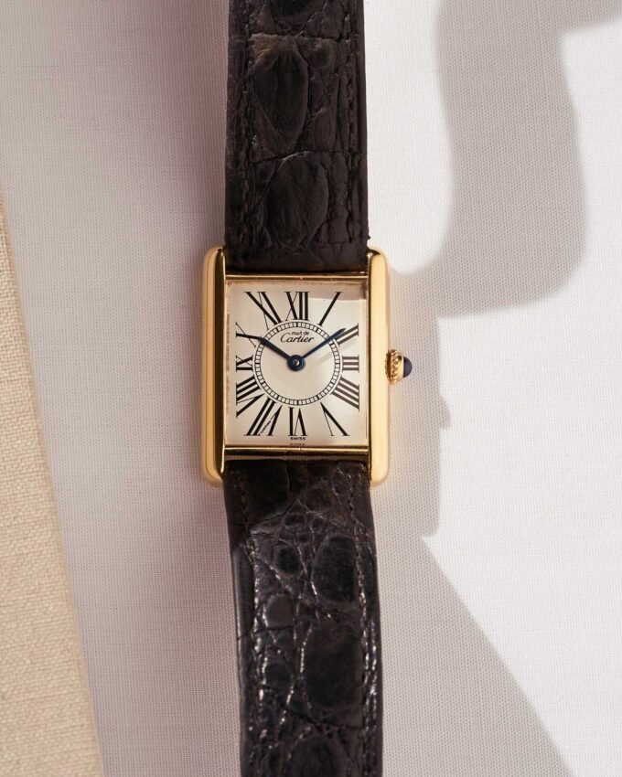 Das Gehäuse der Cartier Must Tank LM besteht aus vergoldetem Edelstahl und hat die charakteristische rechteckige Form, die für die Tank-Serie typisch ist. Diese Form ist inspiriert von den klaren Linien eines Panzerfahrzeugs (daher der Name „Tank“) und verleiht der Uhr ein markantes und zugleich elegantes Erscheinungsbild.