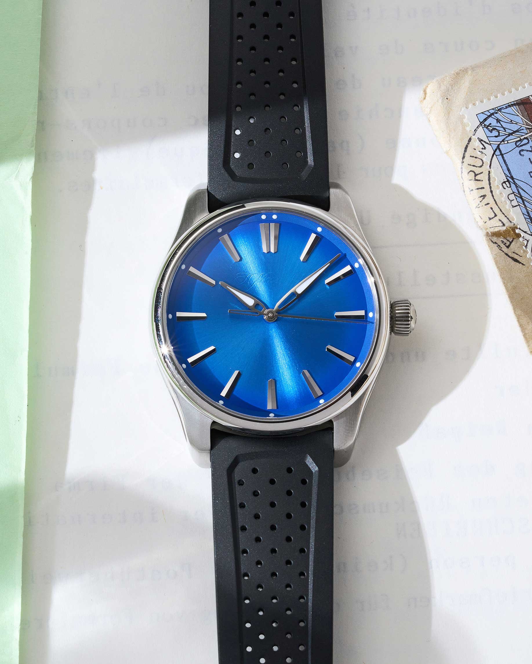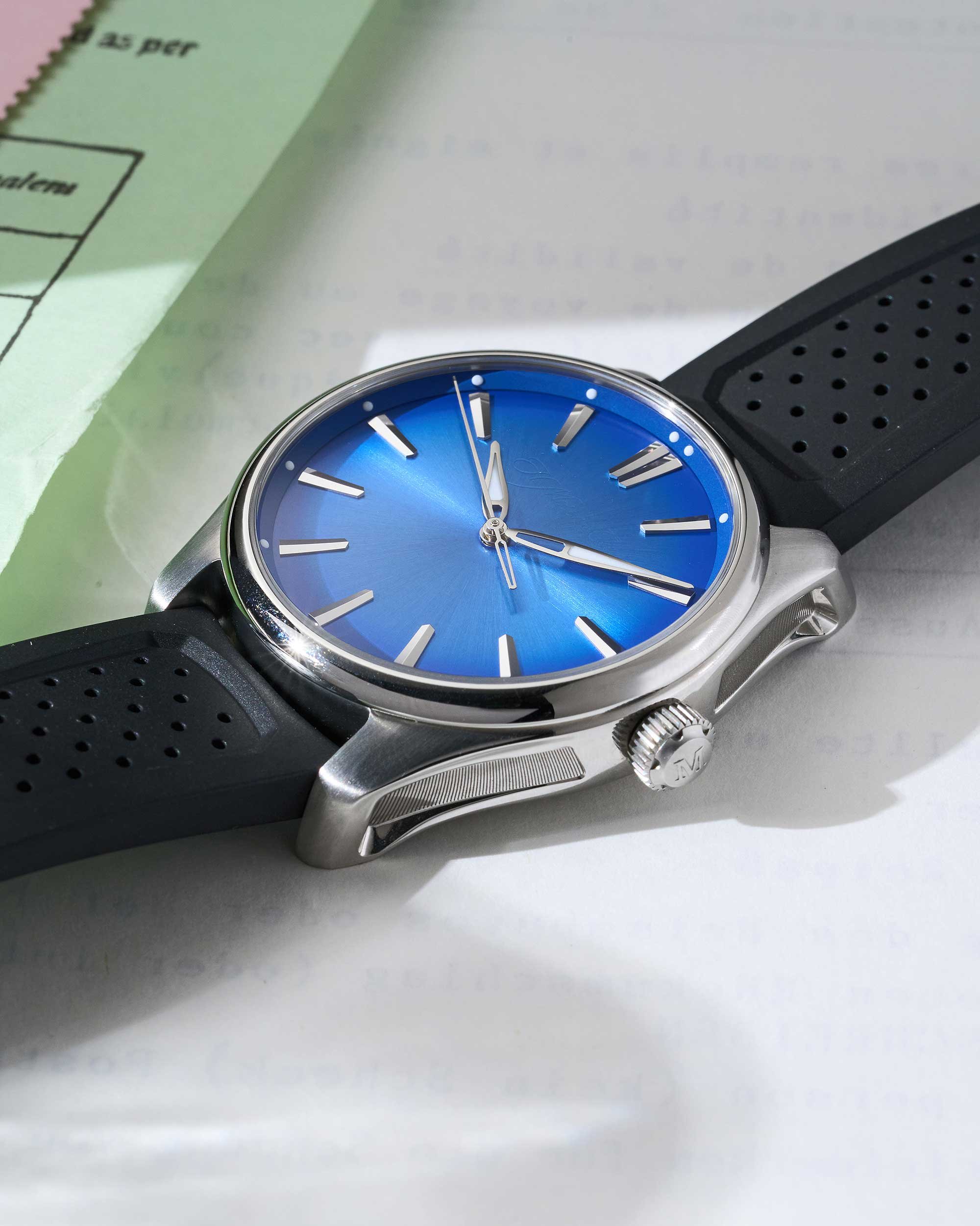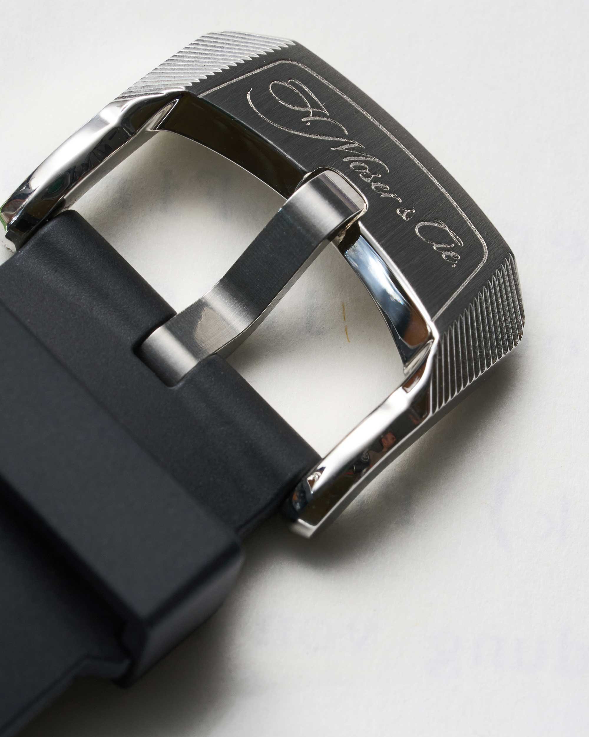 Ausgestattet ist die Uhr mit einem schwarzen Kautschukband, das sowohl sportlichen Komfort als auch hohe Alltagstauglichkeit bietet. Das Band schmiegt sich angenehm ans Handgelenk und wird durch eine Edelstahl-Dornschließe sicher fixiert, passend zum robusten Charakter der Pioneer.
