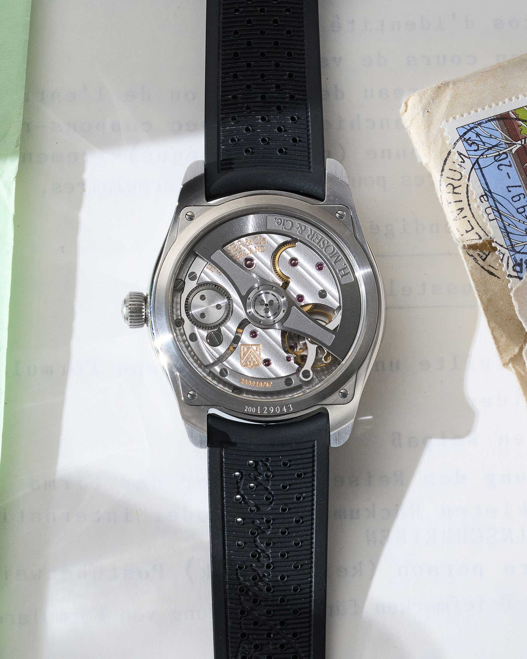 Im Inneren arbeitet das hauseigene Automatik-Manufakturkaliber HMC 200. Dieses Uhrwerk ist mit einer beidseitig aufziehenden Schwungmasse ausgestattet und bietet eine Gangreserve von ca. 72 Stunden. Die Verwendung einer hauseigenen Straumann-Doppelspirale sorgt für hohe Gangstabilität und Präzision. Durch den Saphirglasboden lässt sich das fein veredelte Werk mit seinen charakteristischen Brücken und Oberflächenbearbeitungen bewundern.