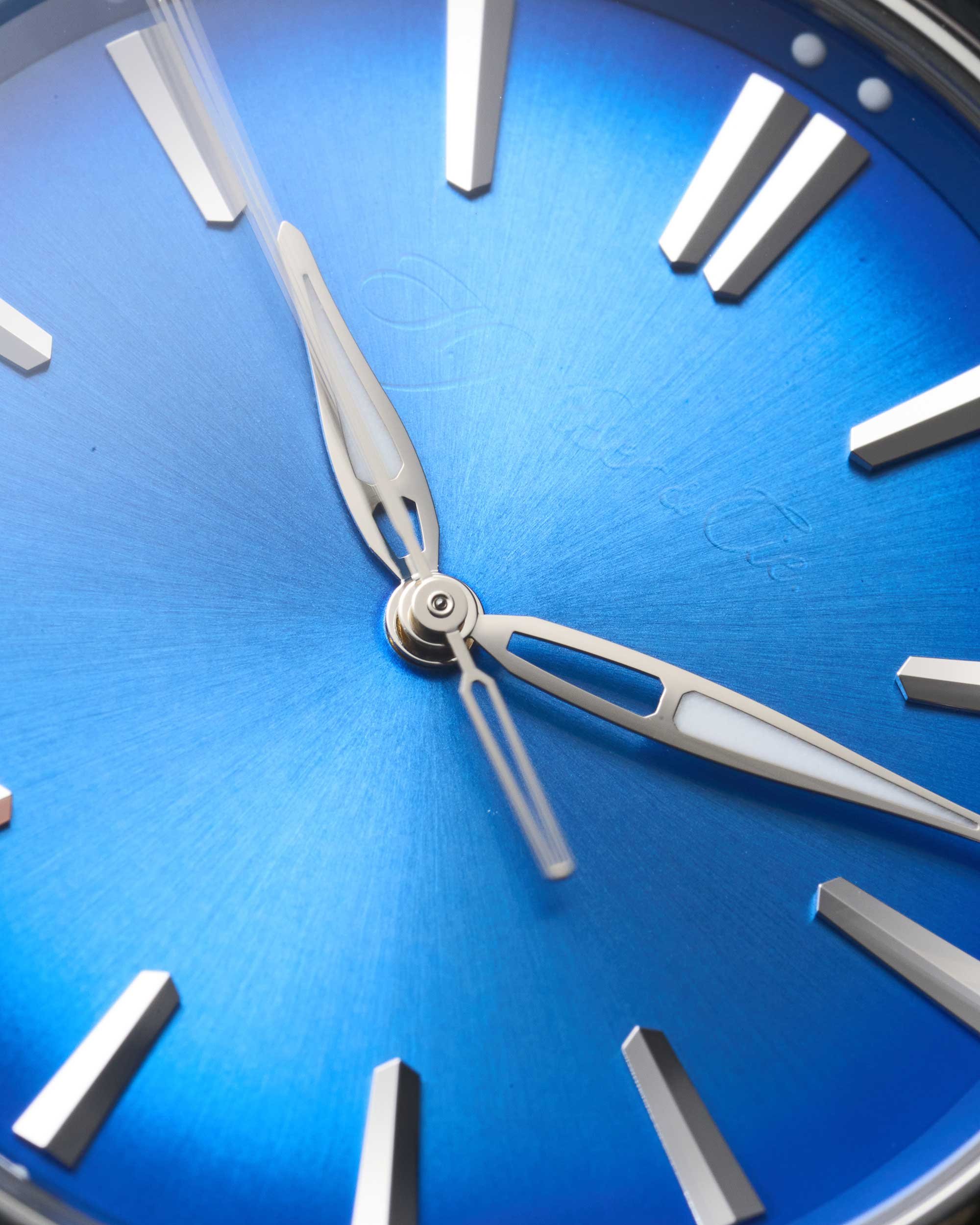 Das Arctic Blue Fumé Zifferblatt ist ein markantes Erkennungsmerkmal dieser Referenz. Der typische Farbverlauf von einem hellen Zentrum zu einem dunkleren Rand verleiht der Uhr eine außergewöhnliche Tiefe und Eleganz. Bewusst verzichtet H. Moser & Cie. auf ein Markenlogo auf dem Zifferblatt, was die minimalistische Designphilosophie der Manufaktur konsequent widerspiegelt. Die applizierten Indizes und zentralen Zeiger sind mit Leuchtmasse versehen und gewährleisten eine hervorragende Ablesbarkeit. Die Anzeige beschränkt sich auf Stunden, Minuten und zentrale Sekunde und betont damit die puristische Ausrichtung des Modells.