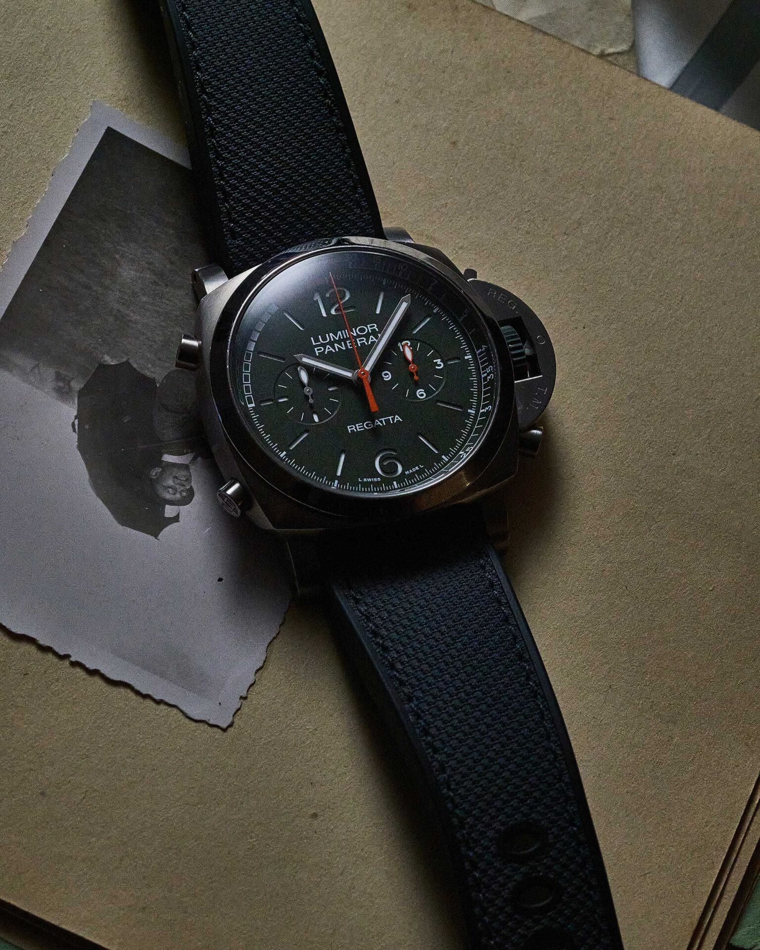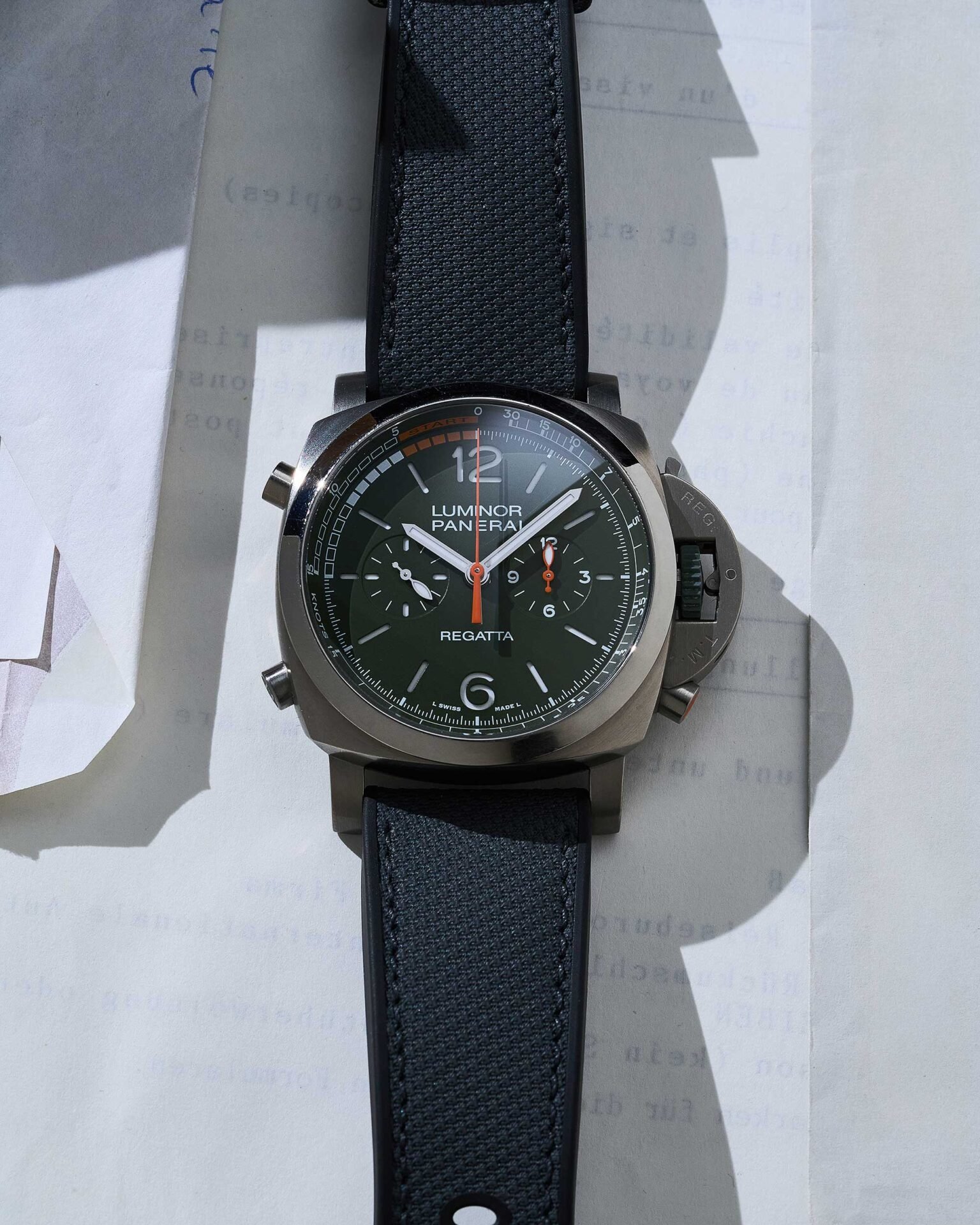 Panerai Luminor Regatta Chronograph Flyback in Titan mit grünem Zifferblatt und schwarzem Kautschukband, Box & Papiere aus 2023, Limited Edition Nummer 001/250