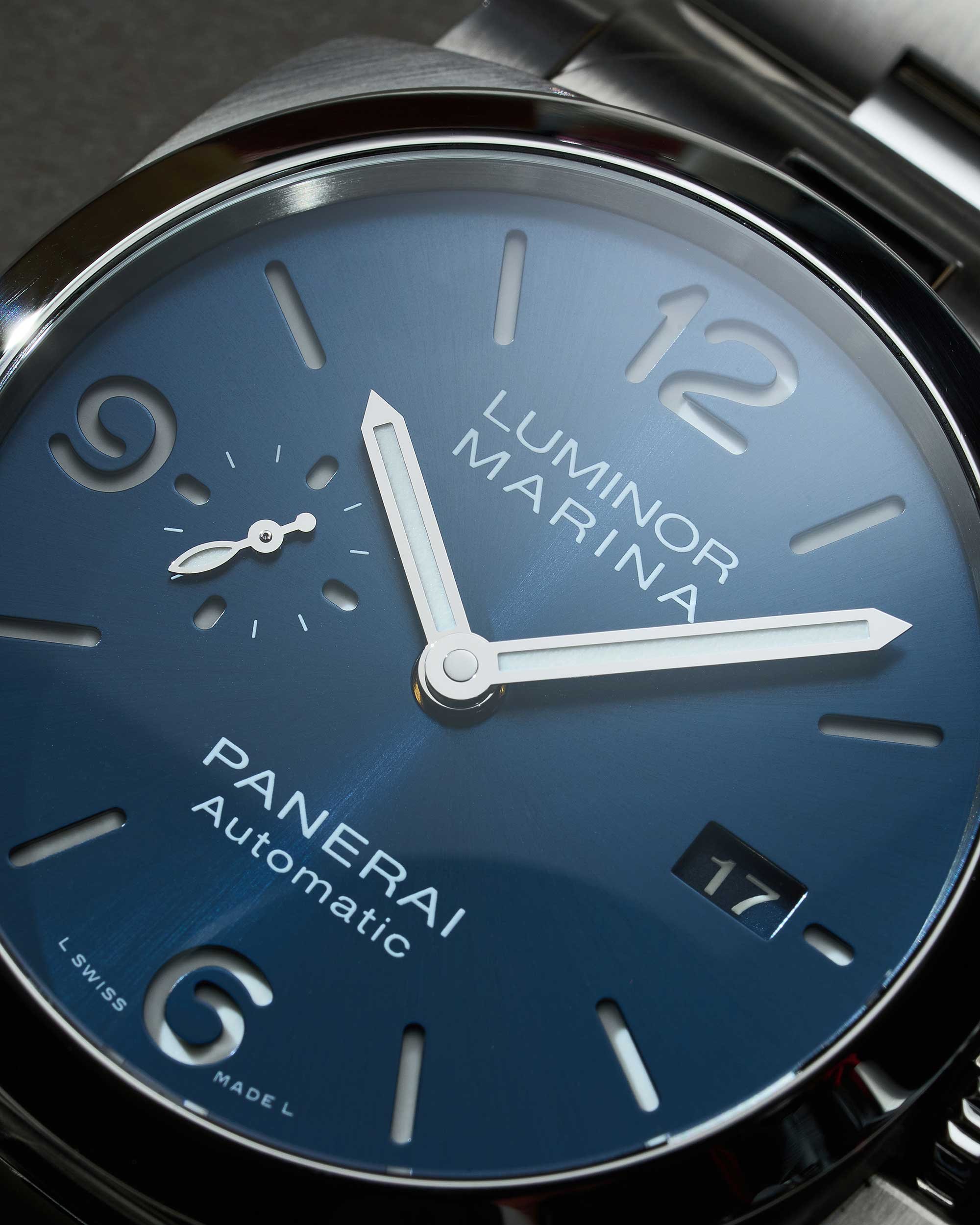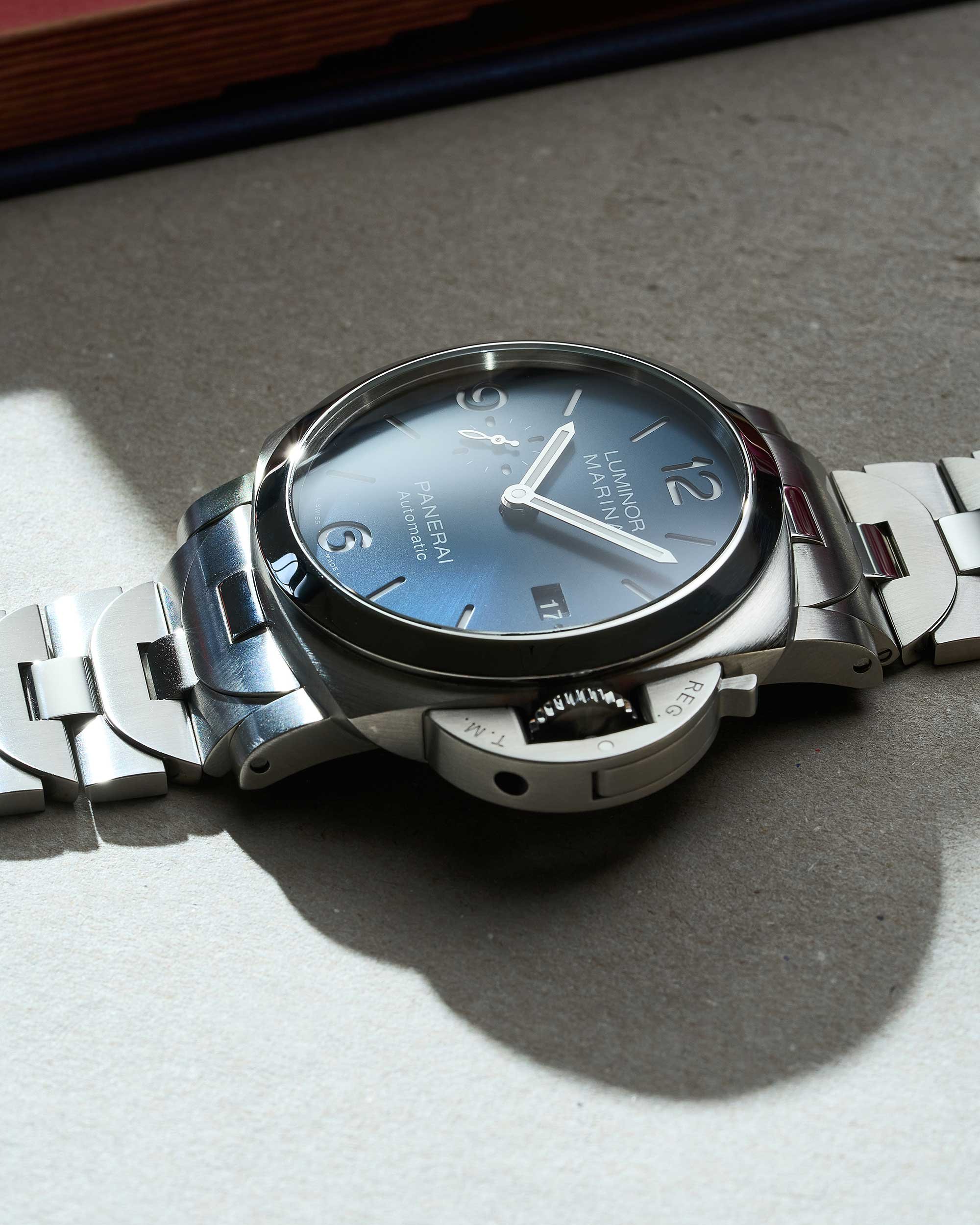 Panerai Luminor Marina in Edelstahl mit blauem Zifferblatt und Edelstahlband, Box & Papiere aus 2021