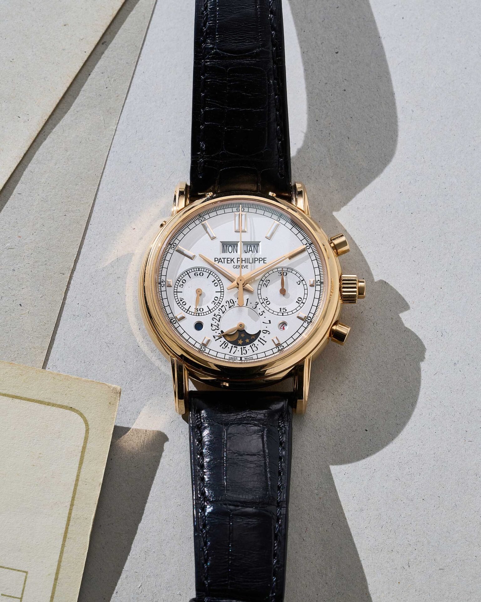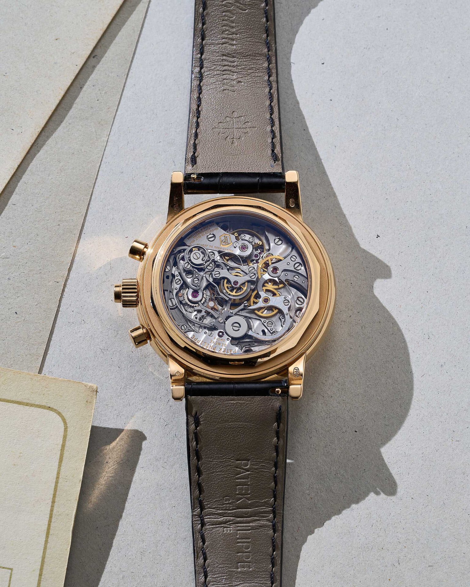 Im Inneren arbeitet das handaufgezogene Kaliber CHR 29-535 PS Q, eines der technisch anspruchsvollsten Werke von Patek Philippe. Es kombiniert einen Schleppzeiger-Chronographen mit einem ewigen Kalender – eine Kombination, die höchste Uhrmacherkunst verkörpert. Das Werk besteht aus 496 Einzelteilen, verfügt über eine Frequenz von 28.800 Halbschwingungen pro Stunde und bietet eine Gangreserve von bis zu 65 Stunden. Die Finissierung mit anglierte Brücken, Genfer Streifen und vergoldeten Gravuren demonstriert Pateks unübertroffene Handwerkskunst.