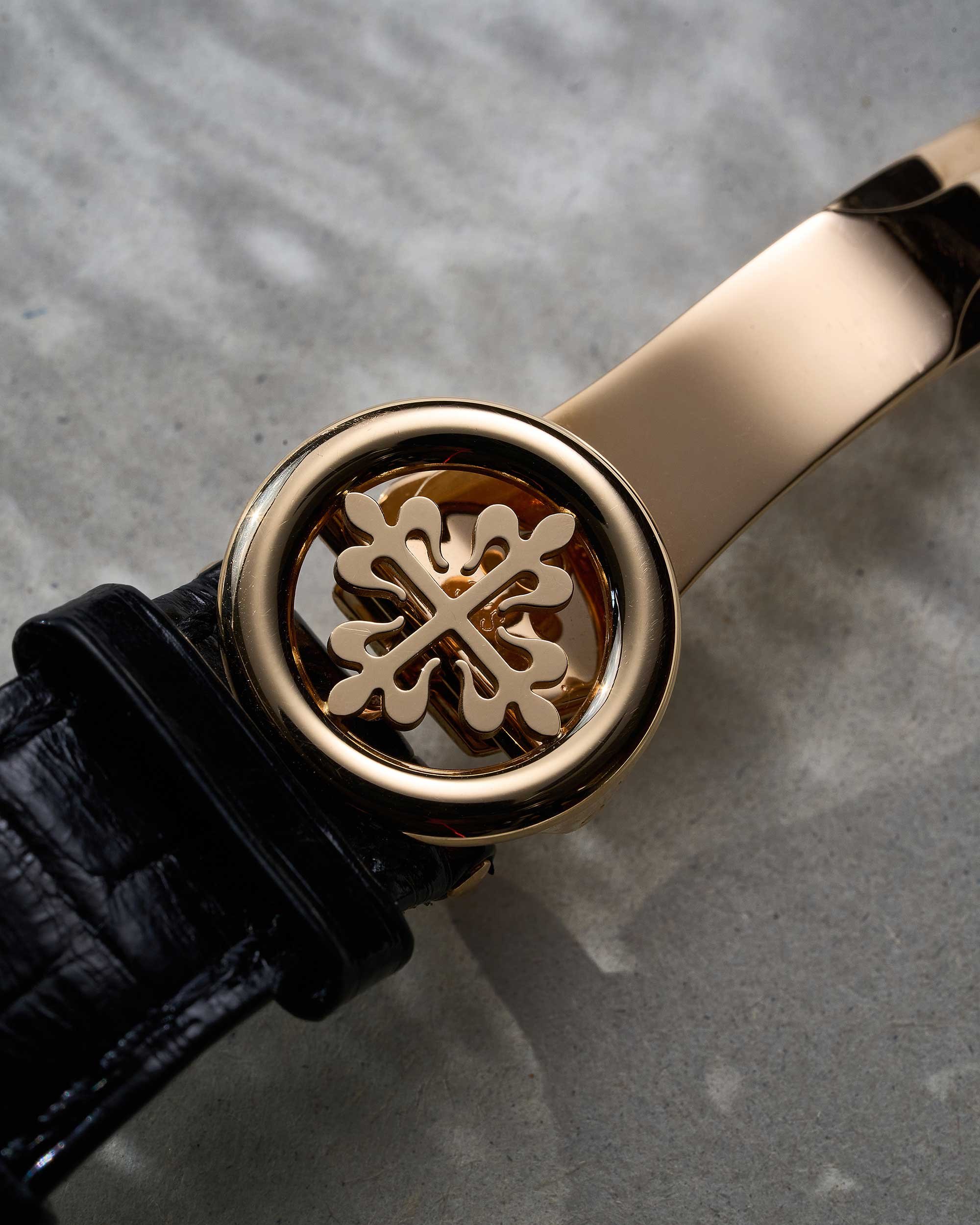 Das schwarze, handgenähte Krokolederarmband verleiht der Uhr eine klassische und luxuriöse Note. Die Faltschließe aus 18k Roségold trägt das Patek Philippe-Logo und rundet das harmonische Gesamtbild ab.