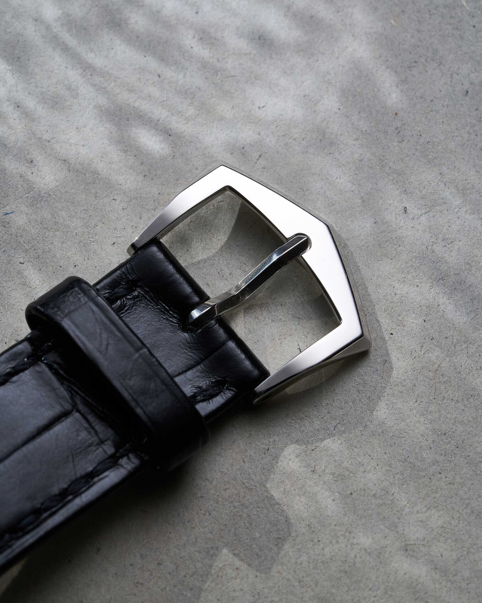 Das schwarze Krokolederarmband wird von einer Dornschließe aus Platin gehalten, die sowohl Sicherheit als auch Tragekomfort garantiert. Die Farbgebung des Armbands ergänzt das dunkle Zifferblatt und unterstreicht die elegante Gesamtoptik der Uhr.