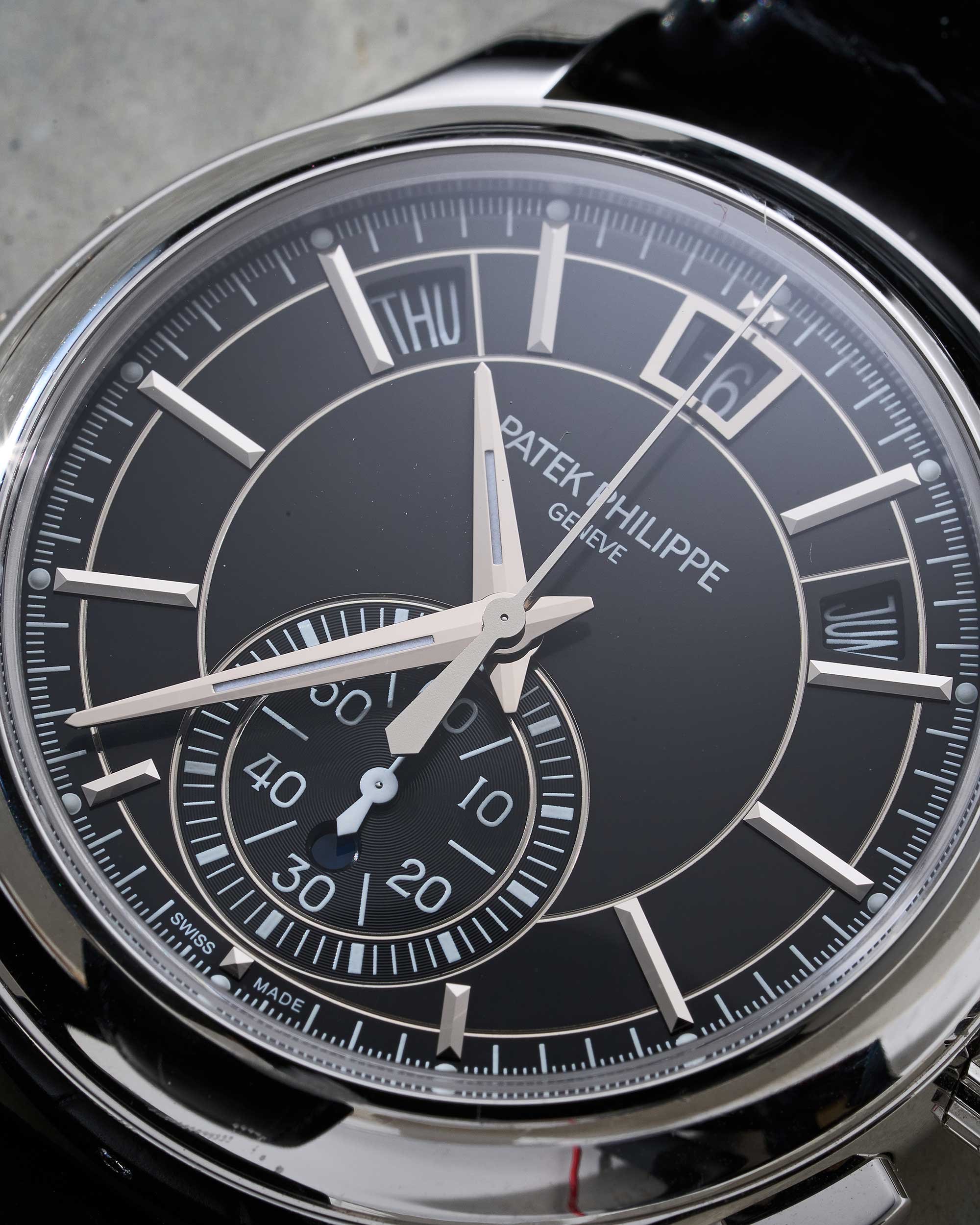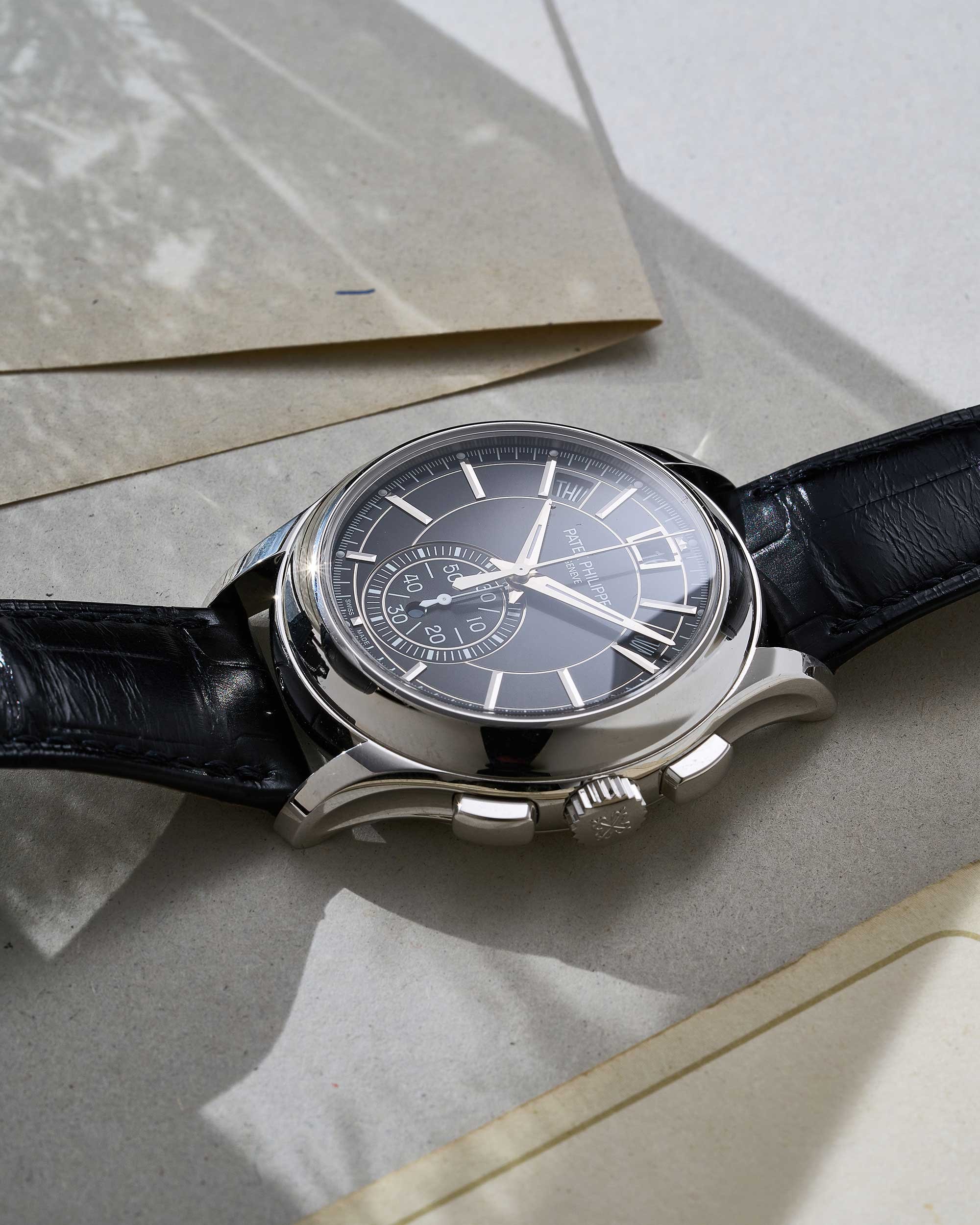 Das schwarze Zifferblatt der 5905P-010 vereint klassische Eleganz mit hoher Funktionalität. Es zeigt Stunden, Minuten und Sekunden sowie einen Flyback-Chronographen an. Der Jahreskalender informiert über Wochentag, Monat und Datum, die harmonisch auf dem Zifferblatt verteilt sind. Die applizierten Weißgold-Stundenindexe sorgen für exzellente Ablesbarkeit und setzen stilvolle Akzente.