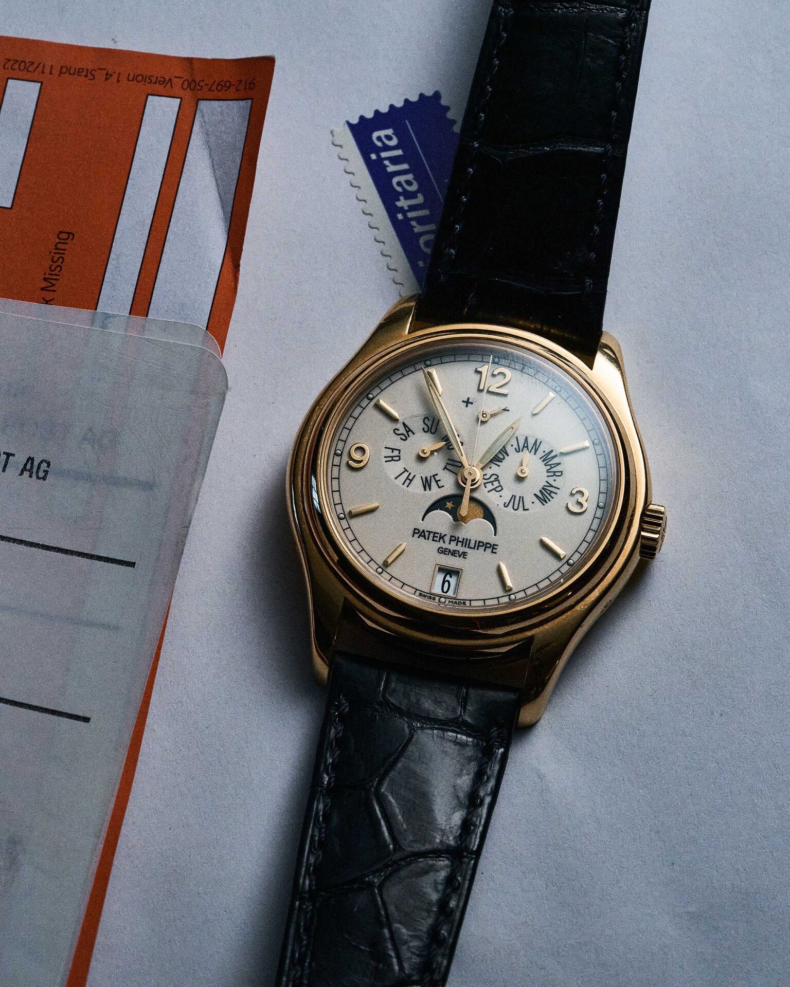 Patek Philippe Annual Calendar in Gelbgold mit schwarzem Krokolederarmband, Faltschließe in Gelbgold, weisses Zifferblatt, Full Set aus 2021