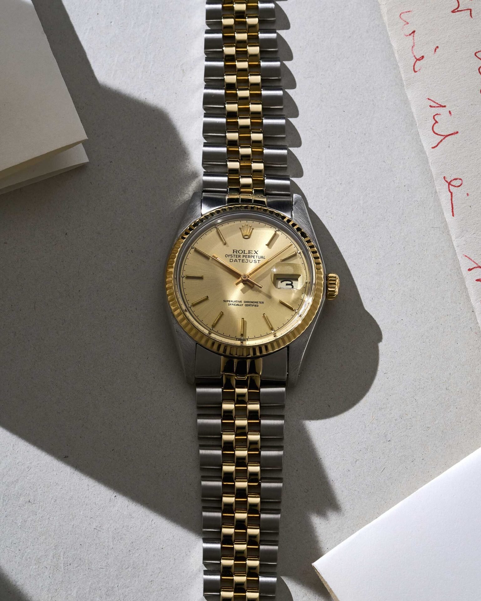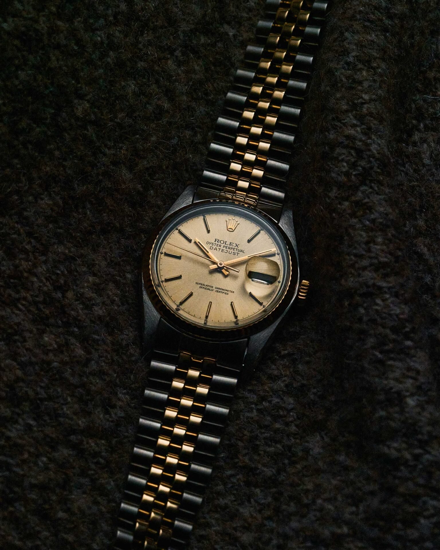Rolex Datejust 36mm in Edelstahl und 18k Gelbgold, champagner Zifferblatt, Plexiglas und Jubiléeband. 5,5 Mio. aus ca. 1978