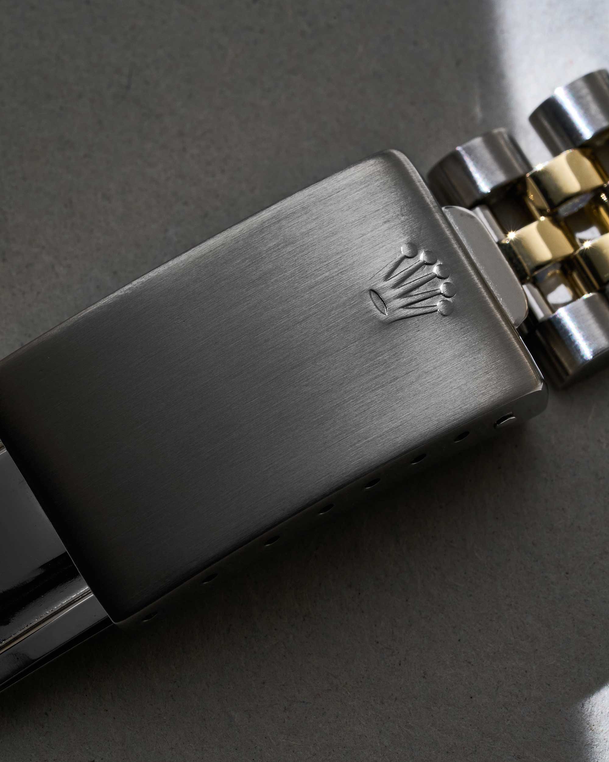 Die Rolex Datejust Referenz 16013 kombiniert ein Edelstahl- und 18k-Gelbgold-Gehäuse mit einem Durchmesser von 36 mm. Die geriffelte Gelbgold-Lünette verleiht der Uhr ein klassisches, elegantes Erscheinungsbild und setzt einen dezenten Akzent zum robusten Edelstahlgehäuse.