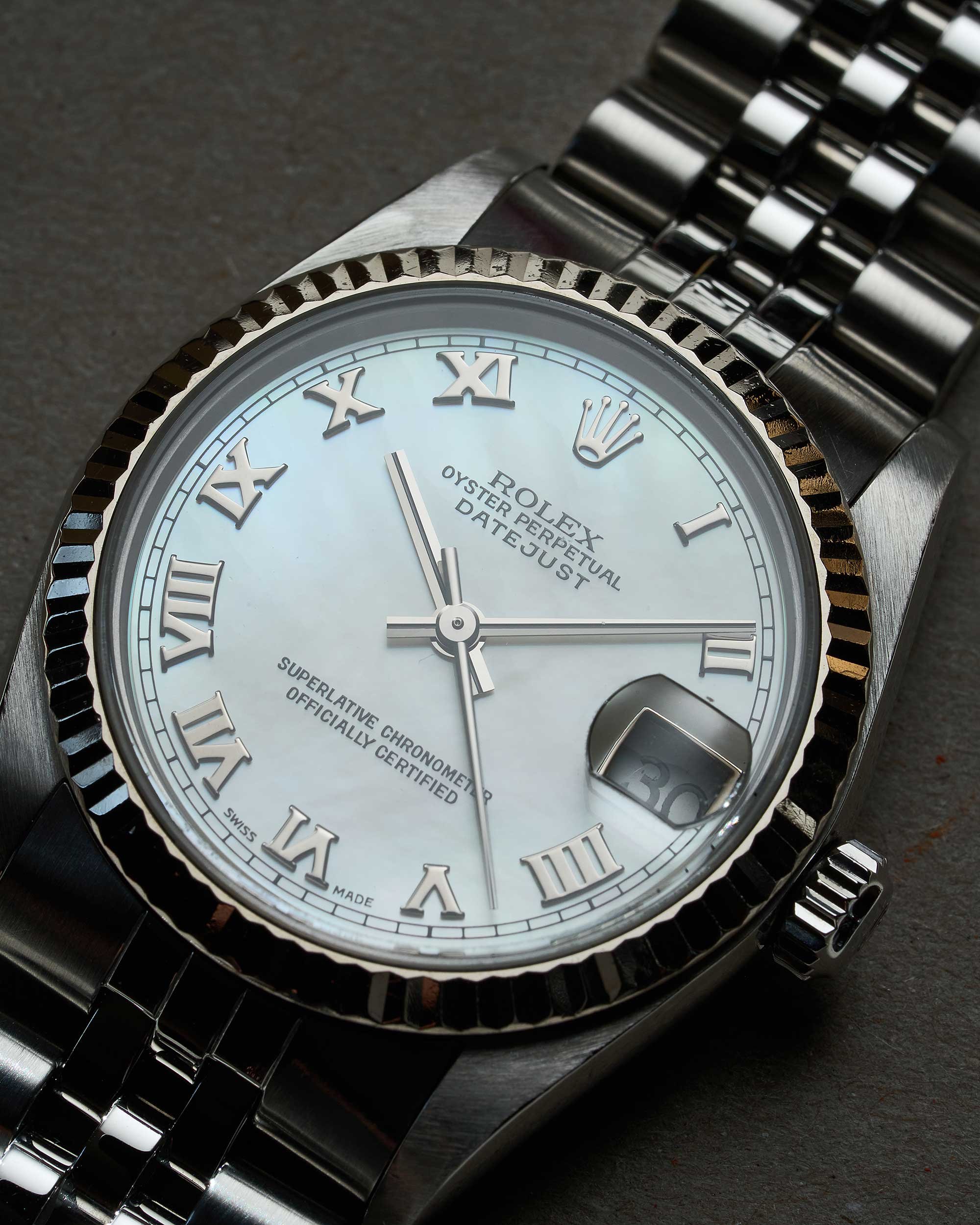 Rolex Date 31mm mit Perlmutt Zifferblatt, geriffelte Weißgoldlünette, Jubilee-Band, Box & Papiere aus 2002
