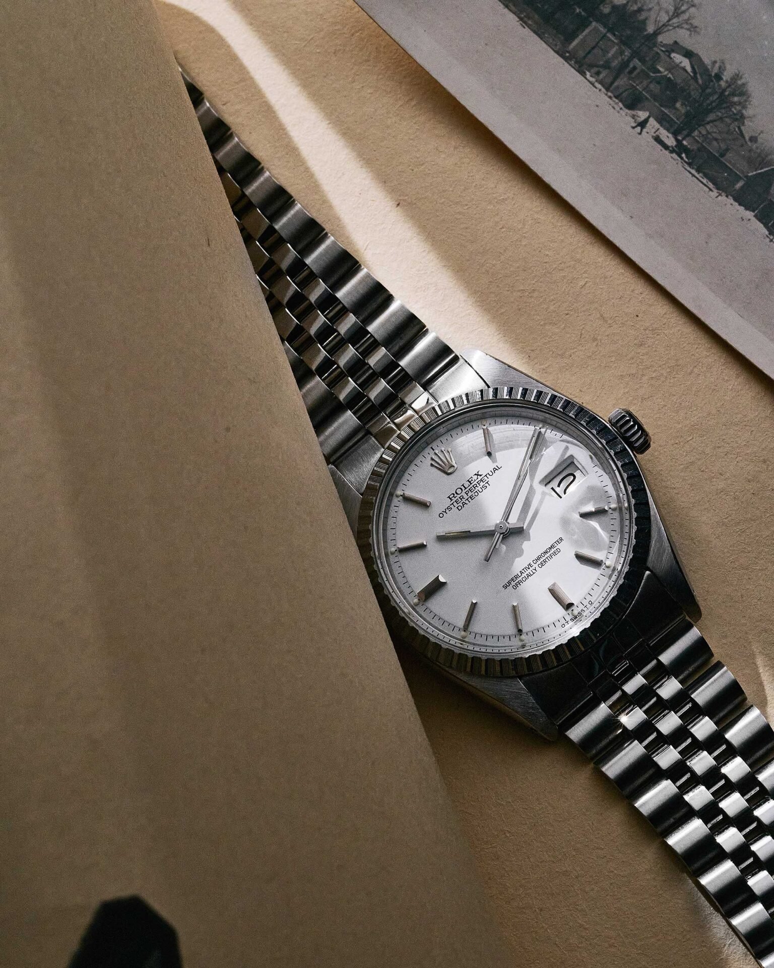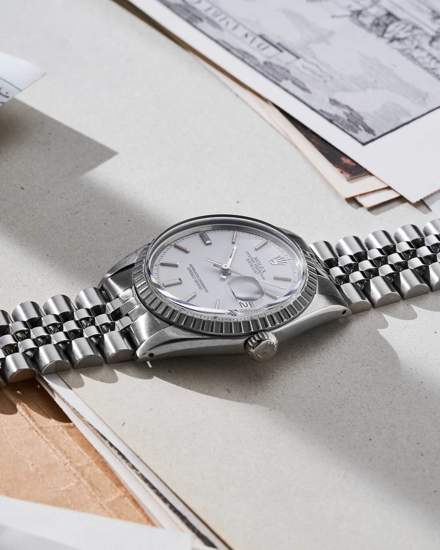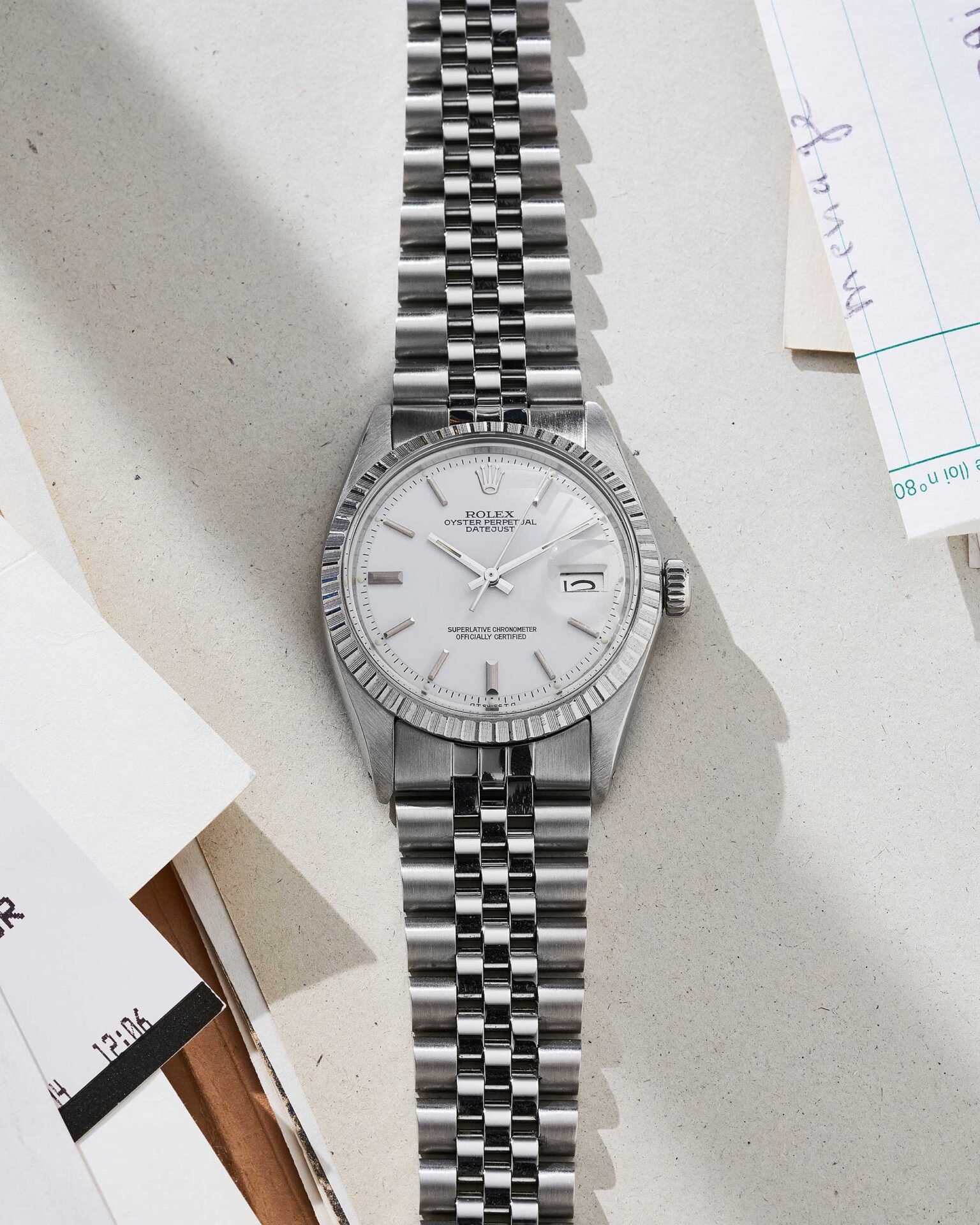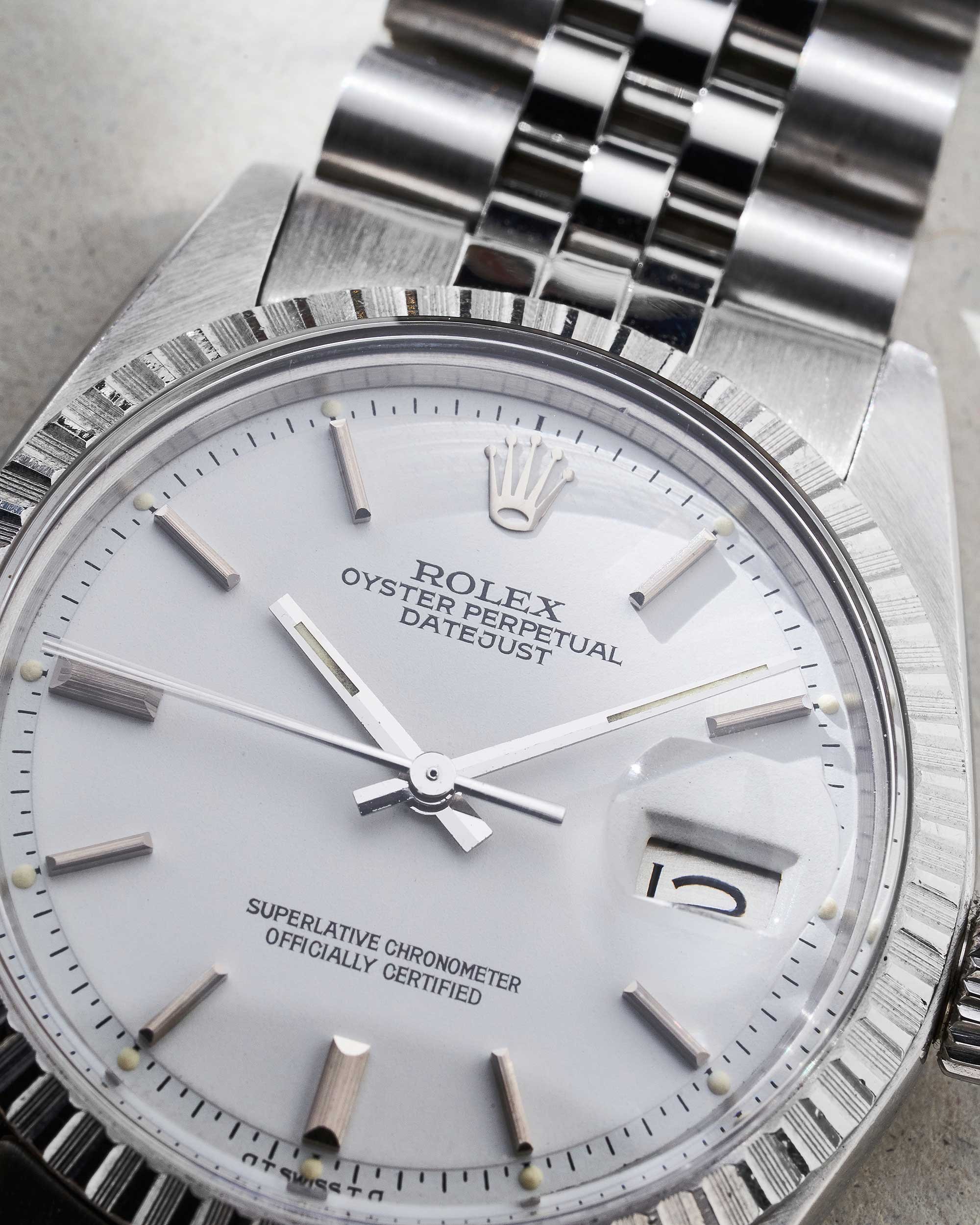 Das weiße Zifferblatt zeigt sich in zeitlos klarer Optik mit aufgesetzten Strichindexen und schlanken Zeigern. Die klassische Datumsanzeige auf drei Uhr mit Zykloplupe sorgt für hervorragende Ablesbarkeit und unterstreicht das funktionale Design der Datejust. Das Zifferblatt ist original und besticht durch seine stimmige, dezente Patina.