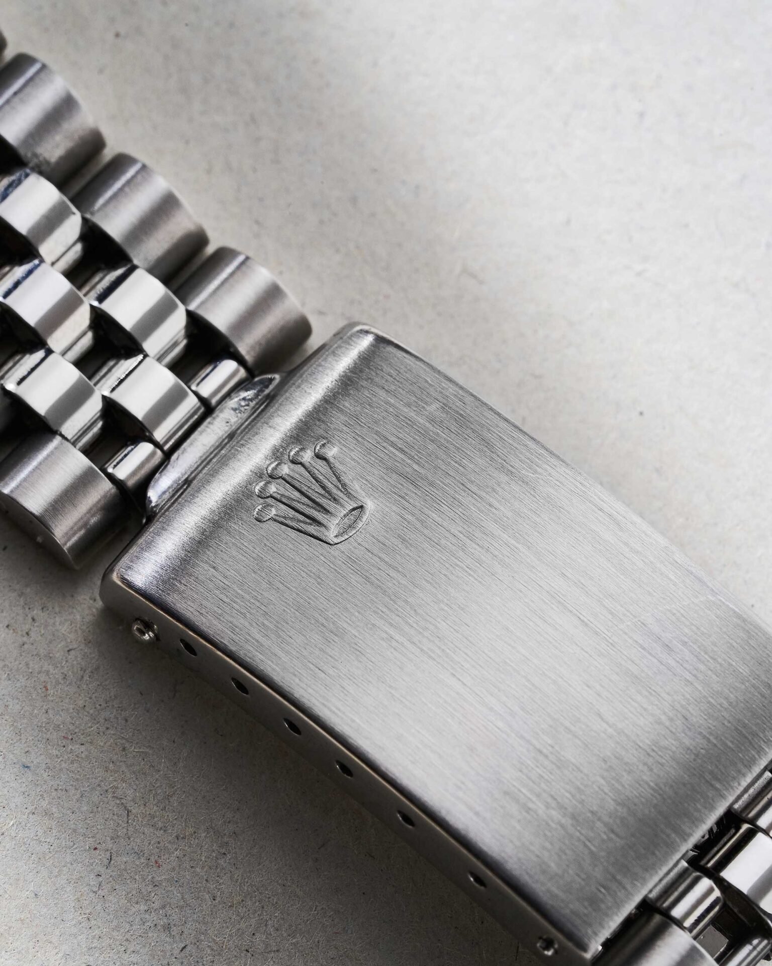 Die Uhr wird an einem originalen Jubilé-Band in Edelstahl getragen. Das fünfgliedrige Band bietet hohen Tragekomfort und harmoniert perfekt mit der klassischen Designsprache des Gehäuses. Die Faltschließe ist mit dem Rolex-Kronenlogo versehen.