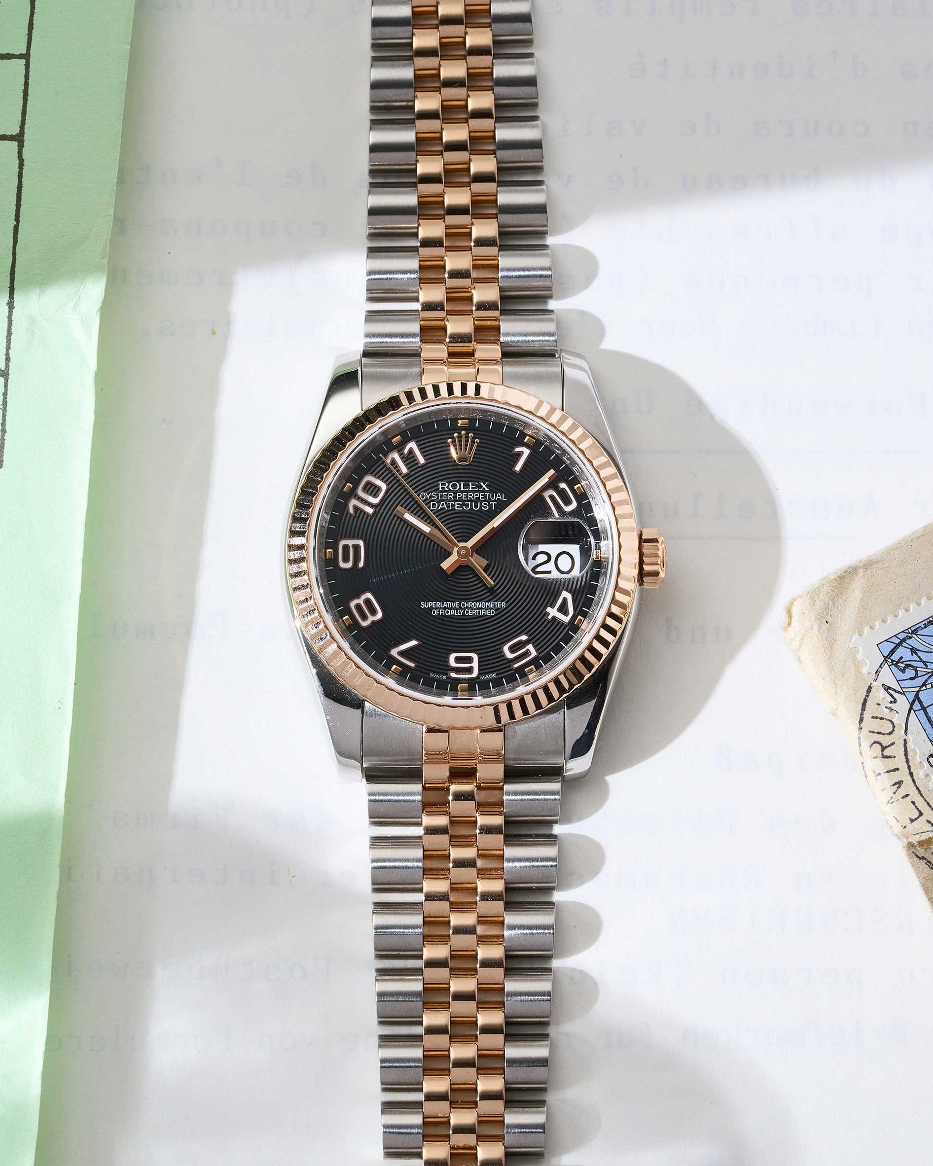 Rolex Datejust 36 in Edelstahl und Roségold mit Jubilee-Band, schwarzes Zifferblatt mit arabischen Indexen, D-Serie aus ca. 2006, Rolex CPO Papiere aus 2024