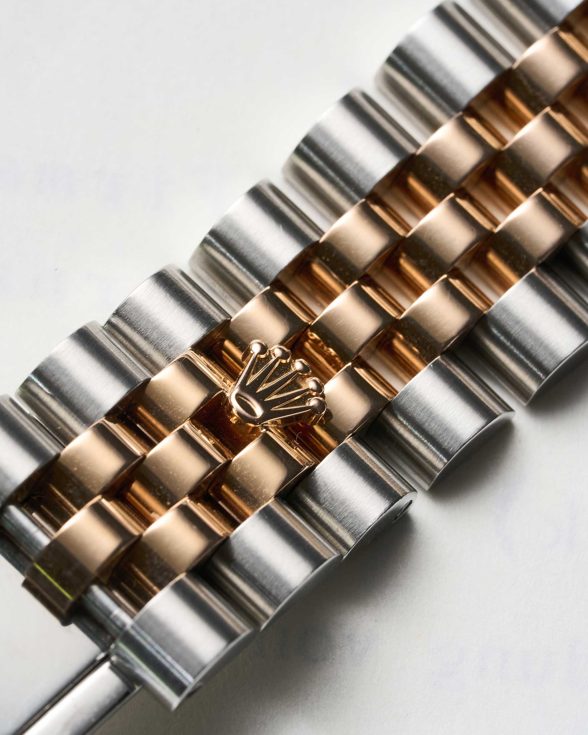 Die Uhr ist mit dem klassischen Jubilee-Band in Edelstahl und Roségold ausgestattet. Das fünfreihige Band bietet hohen Tragekomfort und unterstreicht den eleganten Charakter der Datejust. Abgeschlossen wird es durch eine verdeckte Crownclasp-Faltschließe, die sich harmonisch ins Design integriert.