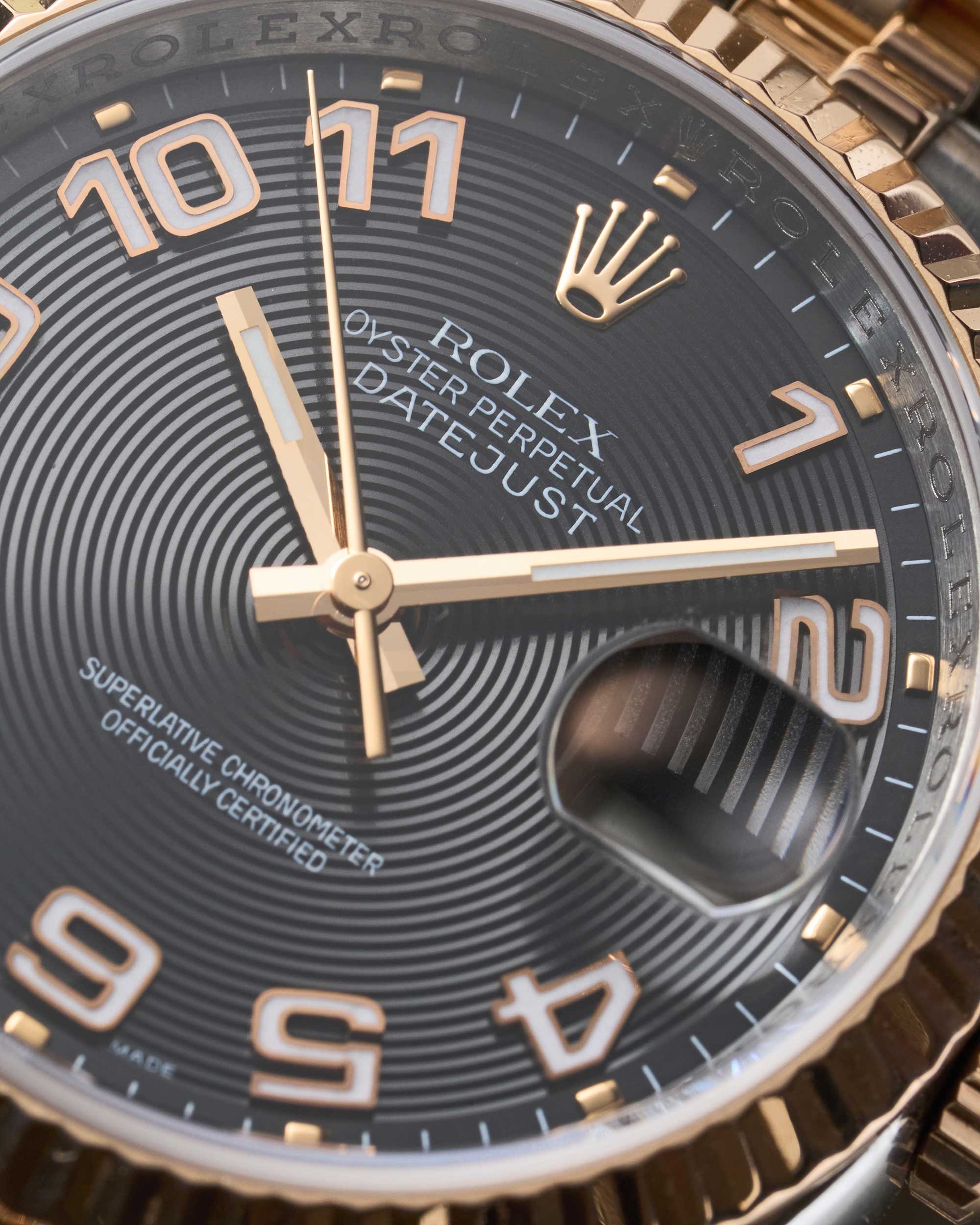 Das schwarze Zifferblatt mit arabischen Indexen verleiht der Uhr eine markante und zugleich seltenere Ausstrahlung innerhalb der Datejust-Kollektion. Die applizierten Ziffern sorgen für eine klare Ablesbarkeit und bilden einen spannenden Kontrast zum dunklen Zifferblatt. Neben der Anzeige von Stunden, Minuten und Zentralsekunde verfügt die Uhr über die charakteristische Datumsanzeige mit Schnellverstellung.