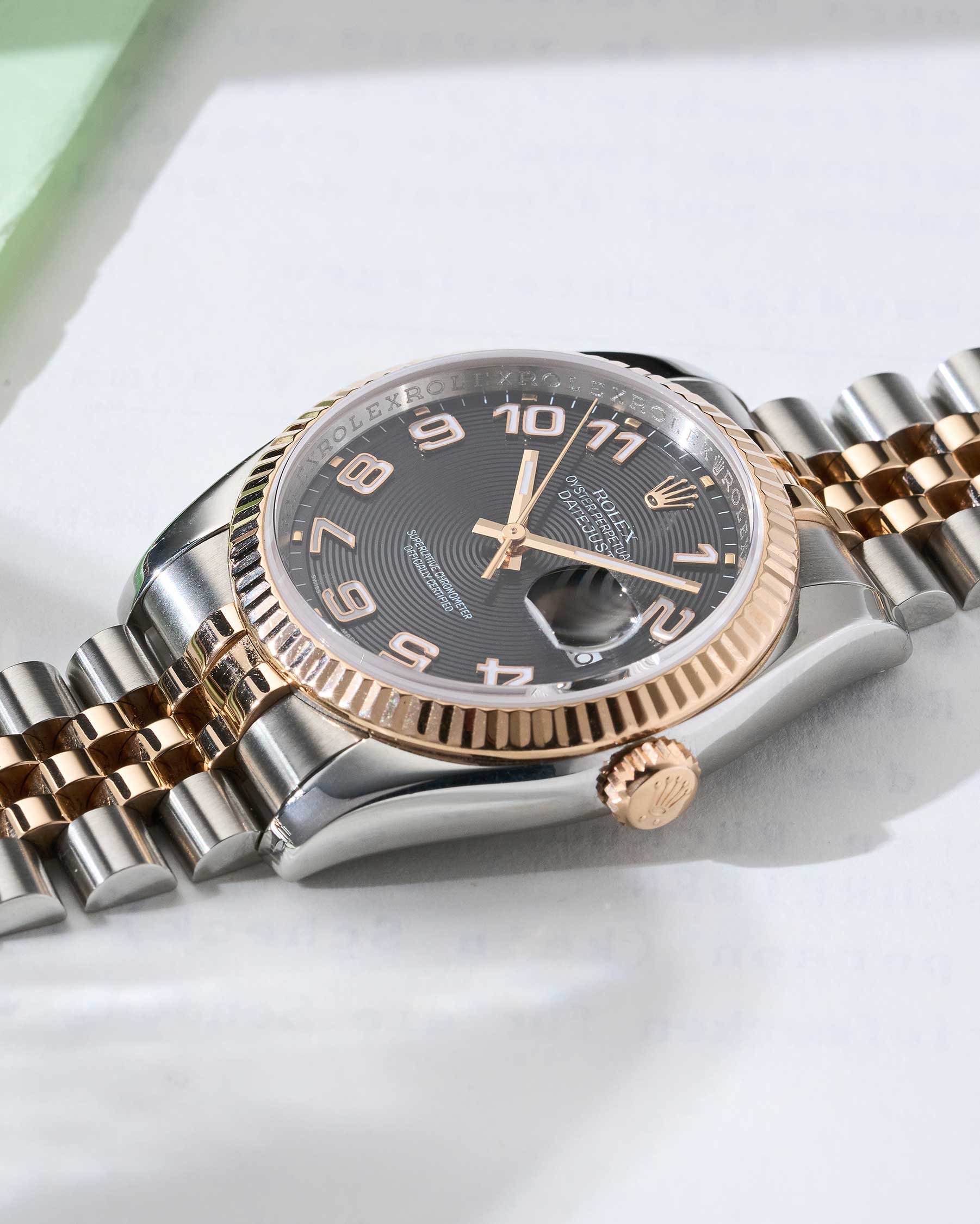 Die Rolex Datejust 36 Referenz 116231 kombiniert Edelstahl mit 18 Karat Roségold (Rolesor Everose) und verkörpert damit die klassische Eleganz der Datejust-Linie. Das 36-mm-Oyster-Gehäuse bietet ausgewogene Proportionen und hohe Alltagstauglichkeit. Die geriffelte Lünette aus Roségold setzt einen edlen Akzent und unterstreicht den ikonischen Charakter des Modells. Geschützt wird das Zifferblatt durch kratzfestes Saphirglas mit integrierter Cyclops-Lupe über dem Datumsfenster bei 3 Uhr.