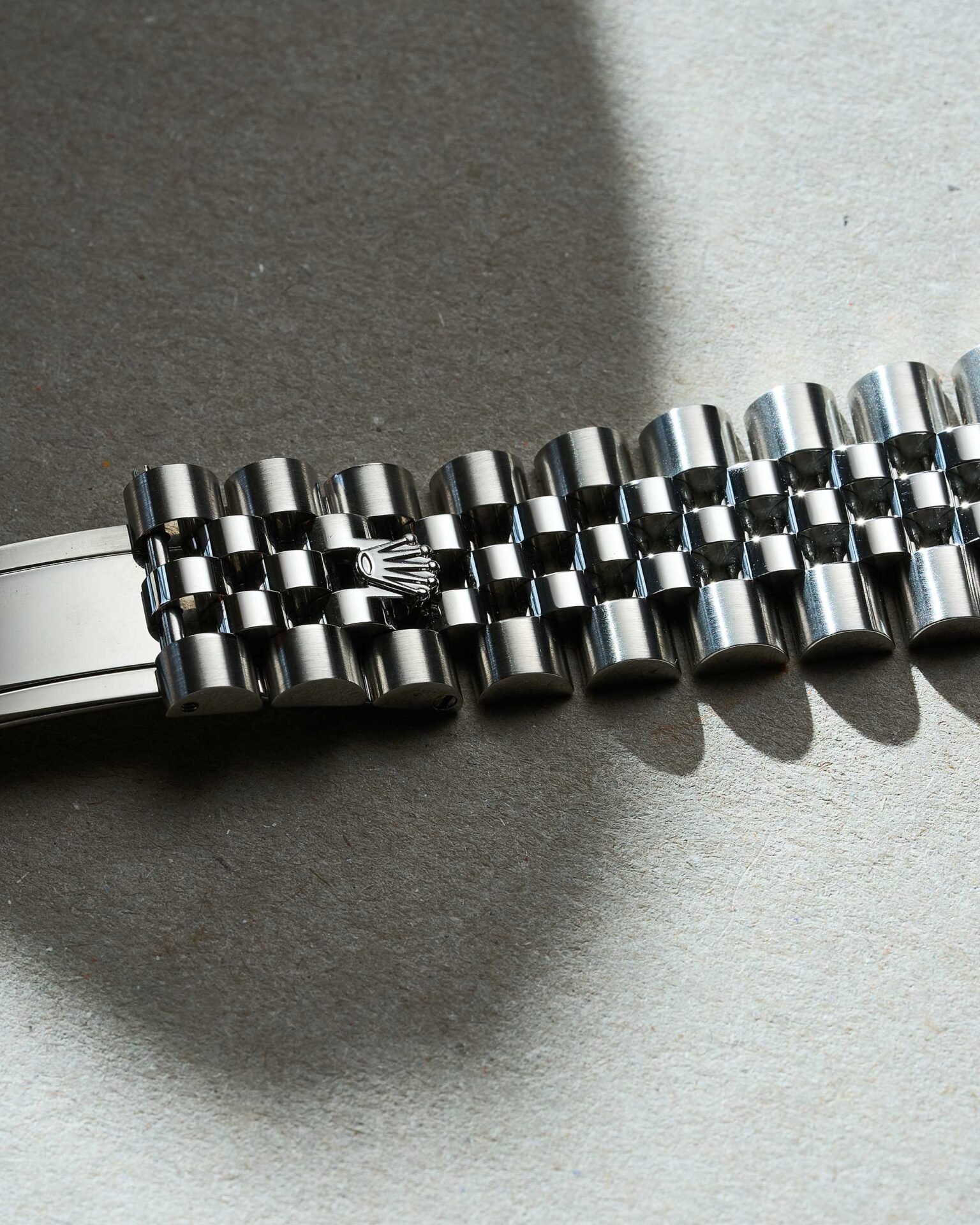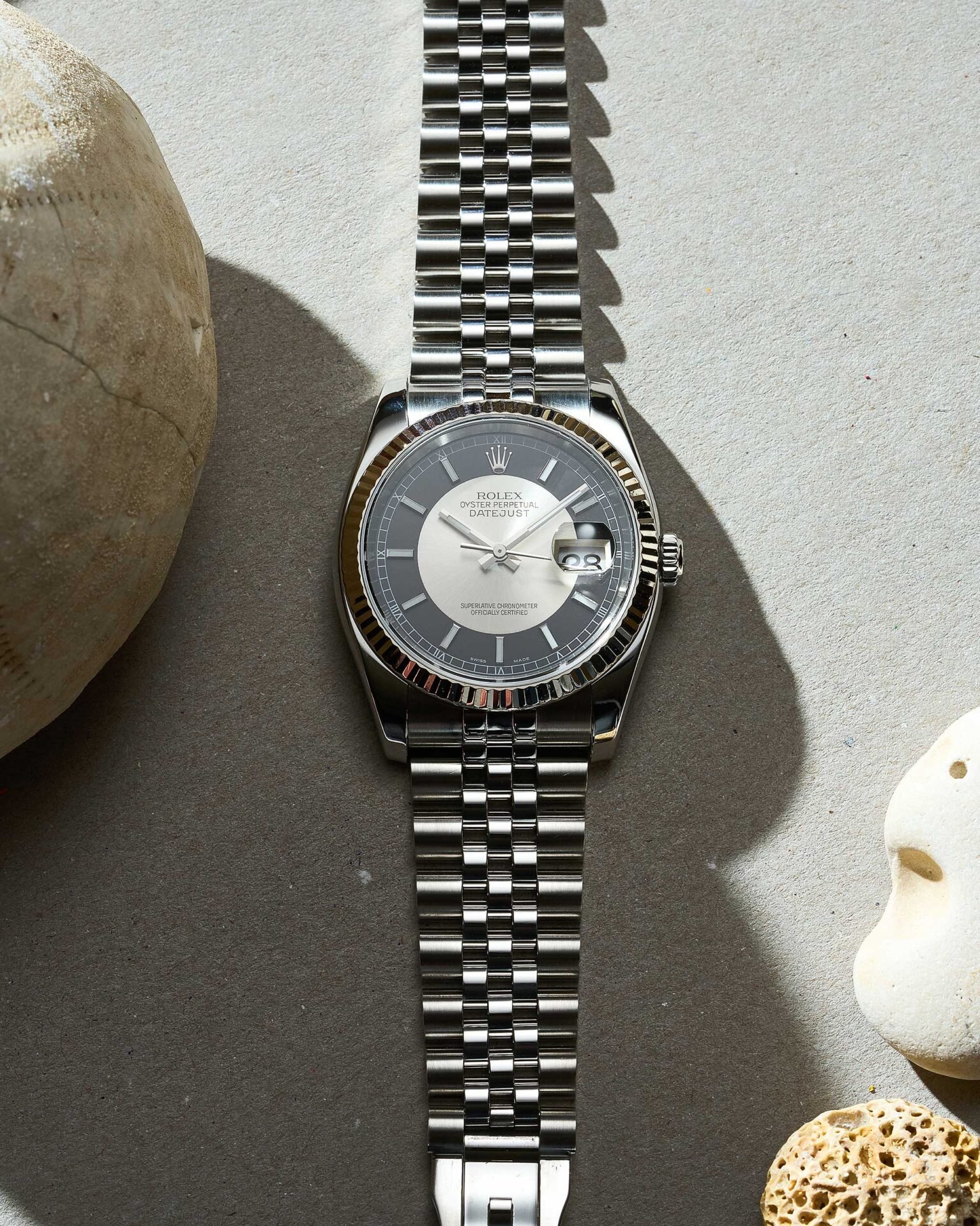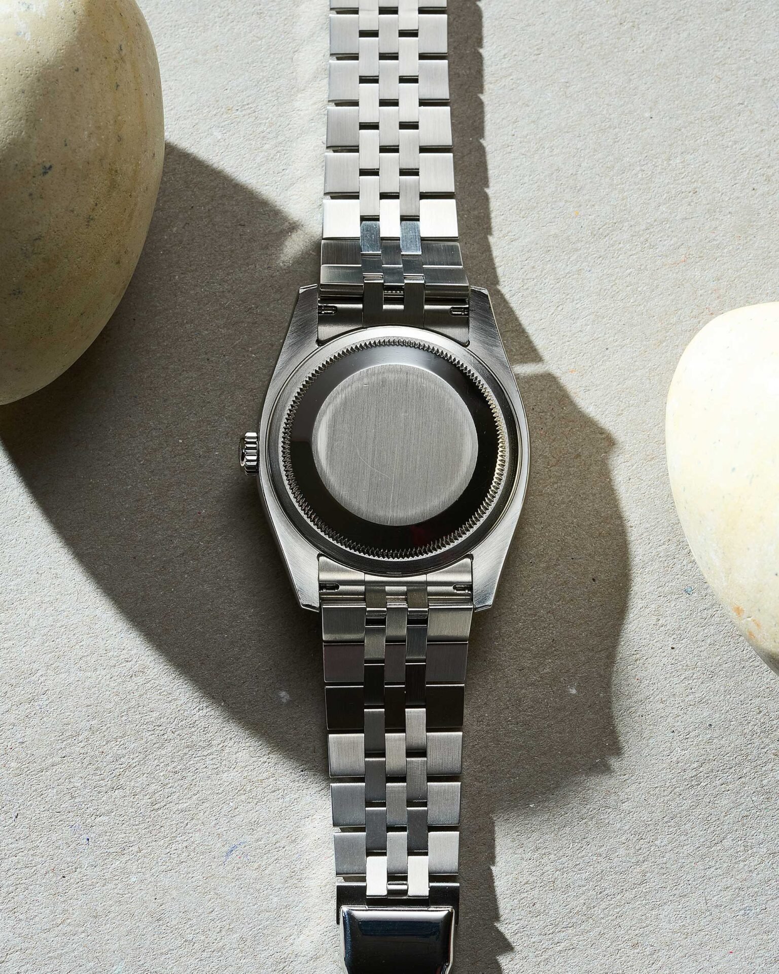 Die Rolex Datejust 116234 verfügt über ein 36-mm-Oyster-Gehäuse aus Edelstahl. Die geriffelte Lünette ist aus 18 Karat Weißgold gefertigt. Das Gehäuse ist mit Saphirglas ausgestattet, die verschraubte Krone entspricht dem Oyster-System.