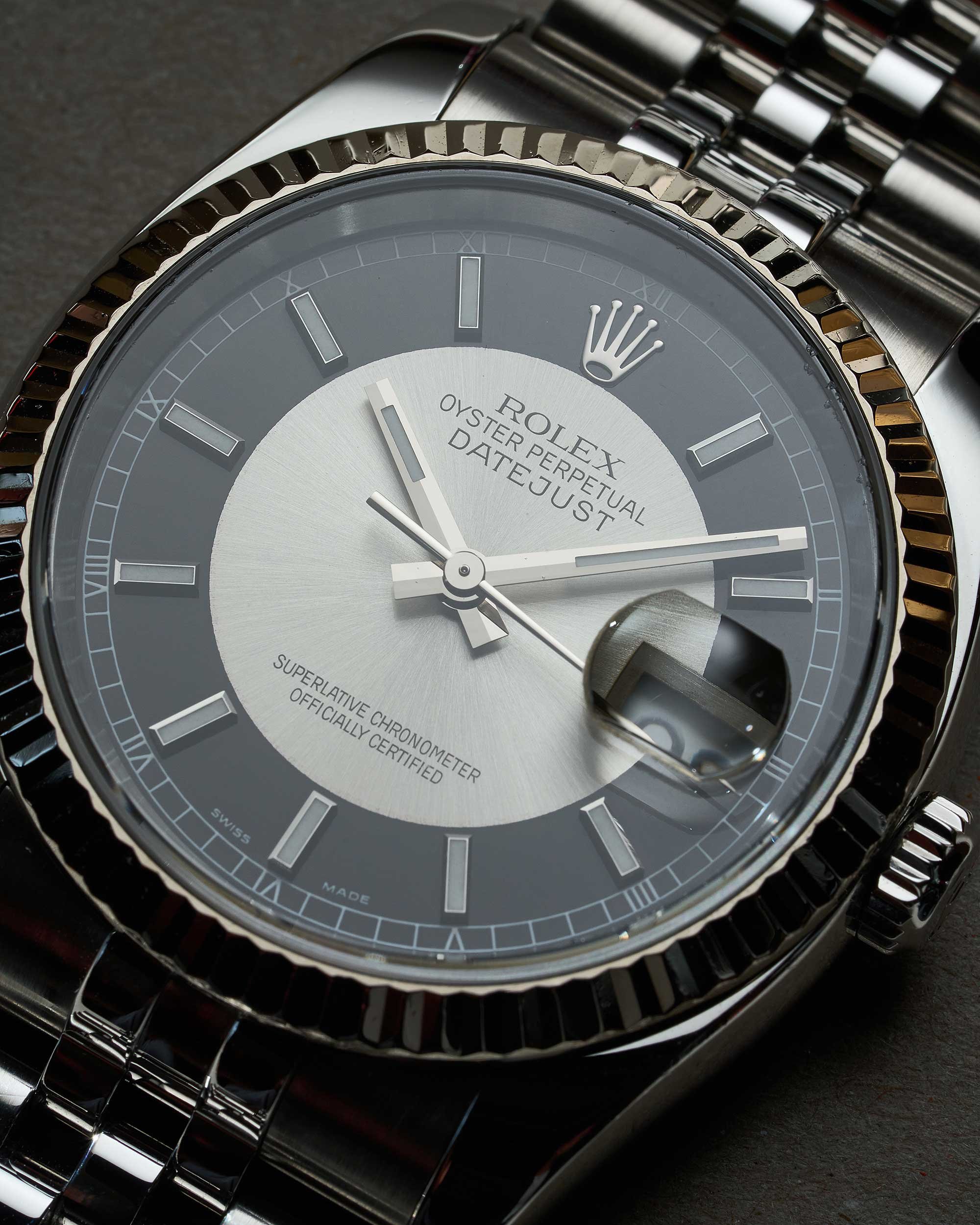 Die Referenz 116234 gehört zur Datejust-Generation mit Saphirglas und modernisiertem Gehäuseaufbau. Die Kombination aus Edelstahlgehäuse, Weißgoldlünette und Tuxedo-Zifferblatt stellt eine weniger häufige Zifferblattvariante innerhalb dieser Modellreihe dar. Modelle aus den 2000er-Jahren bilden den Übergang zu den technisch aktualisierten Datejust-Generationen.
