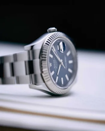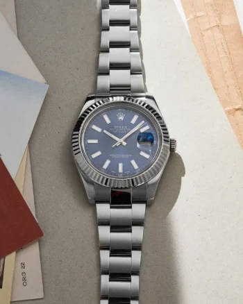 Die Rolex Datejust 41, Referenz 126334, kombiniert ein 41-mm-Gehäuse aus Edelstahl mit einer geriffelten Lünette aus Weißgold. Diese klassische Rolesor-Konfiguration verbindet hohe Widerstandsfähigkeit mit einer luxuriösen Optik.