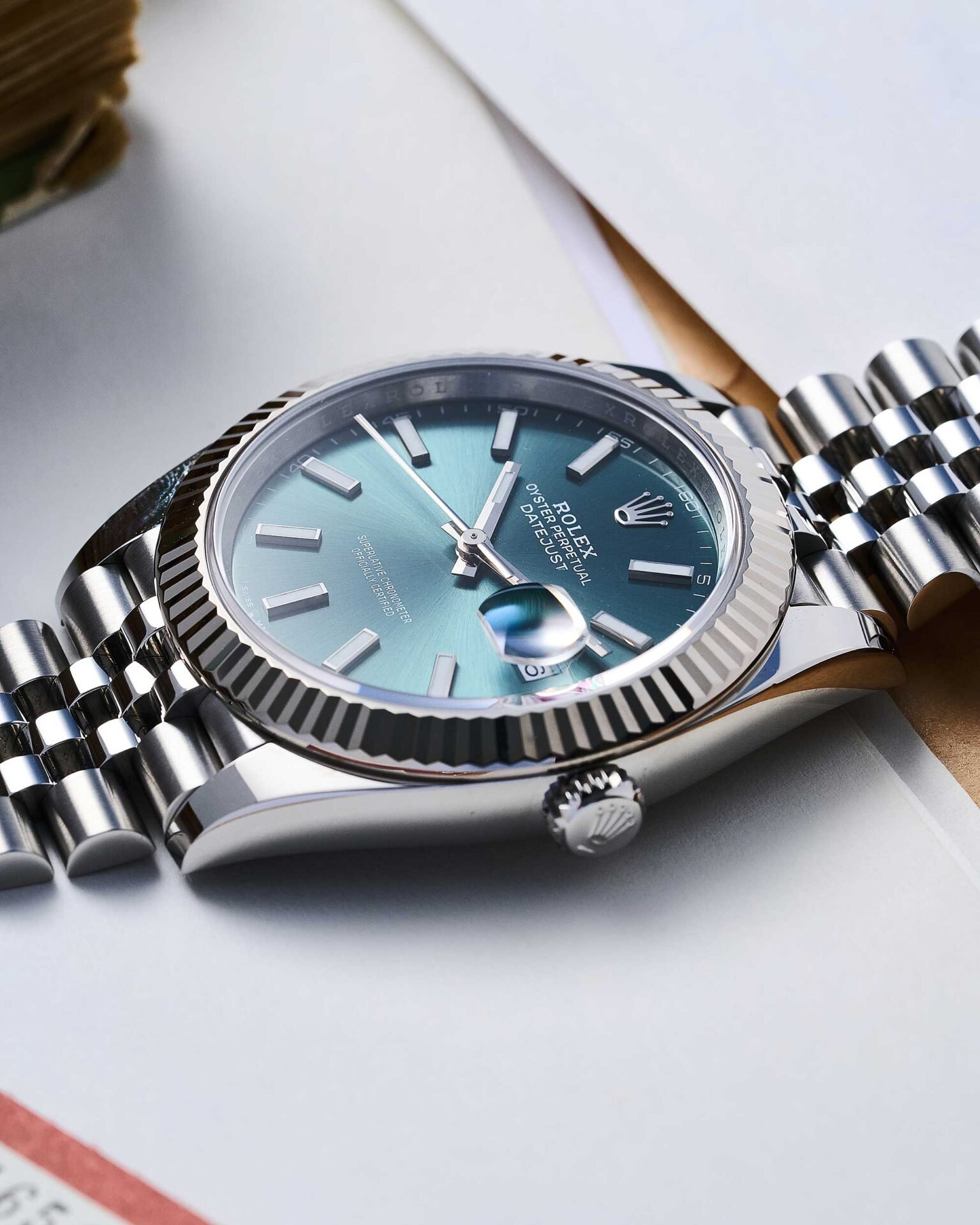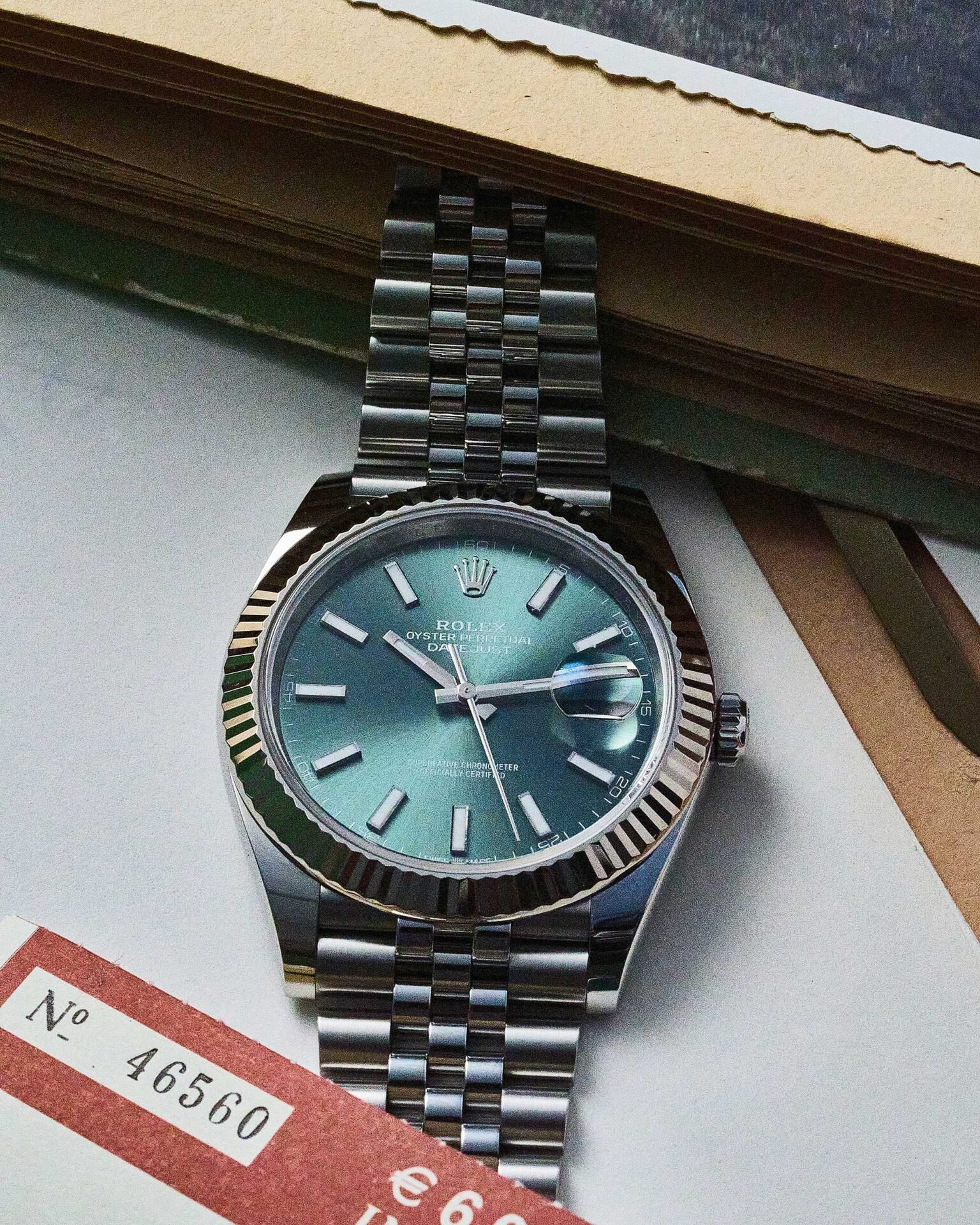 Rolex Datejust 41 mit grünem Zifferblatt, Strich Indexe, Jubilee-Band, geriffelte Weißgold Lünette, Box & Papiere aus 2022