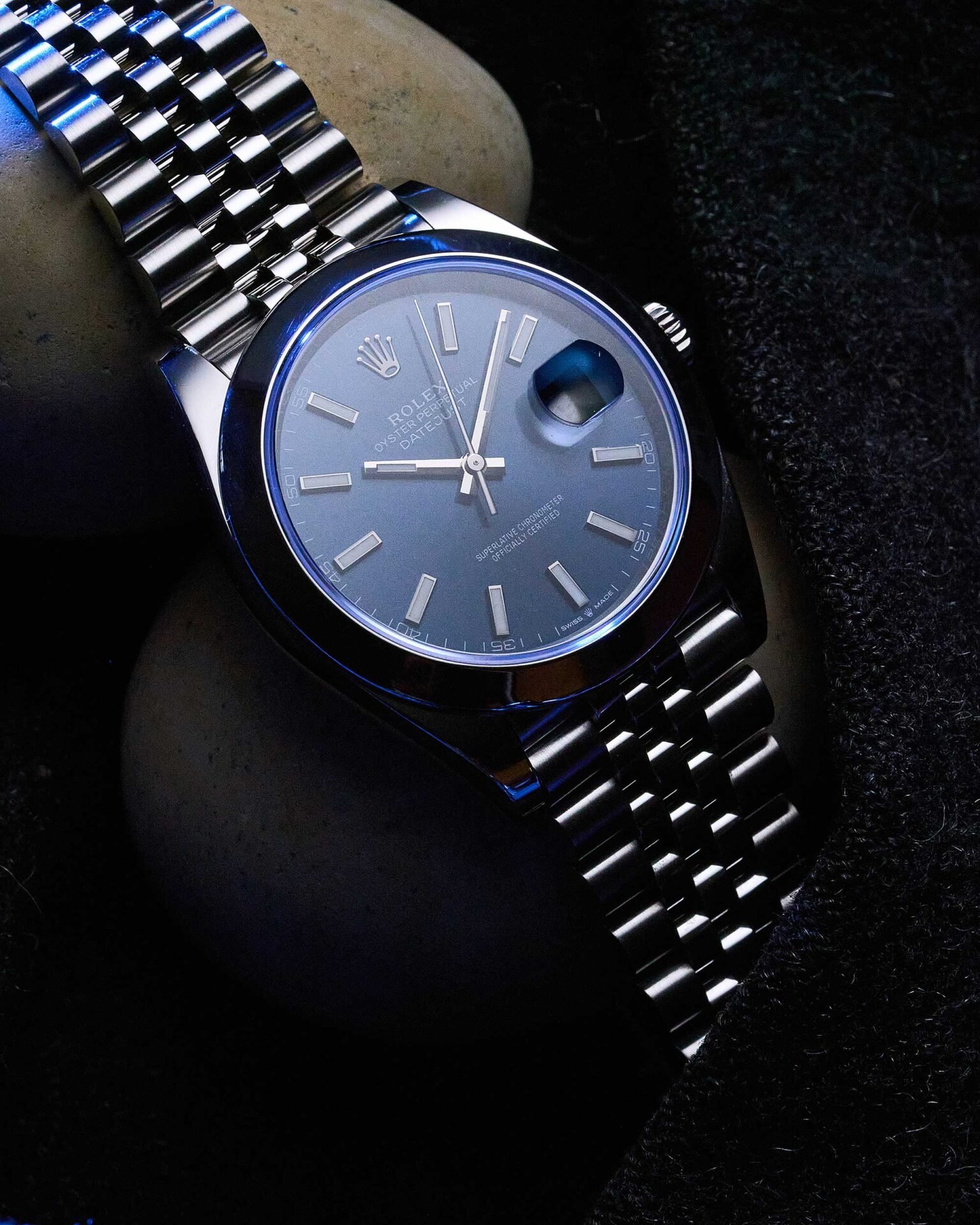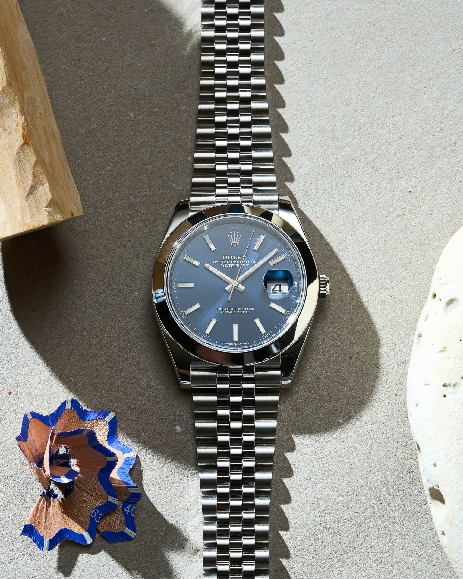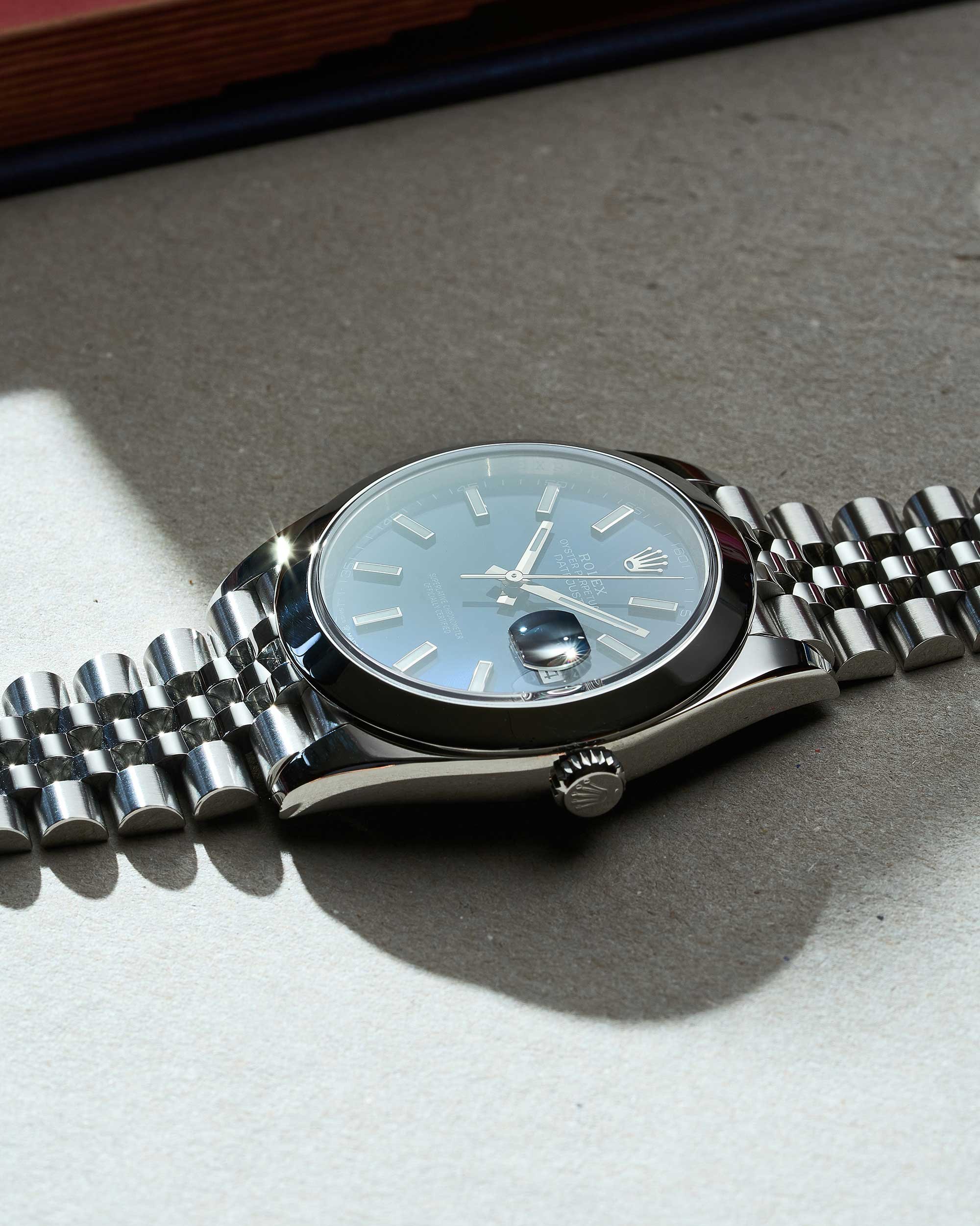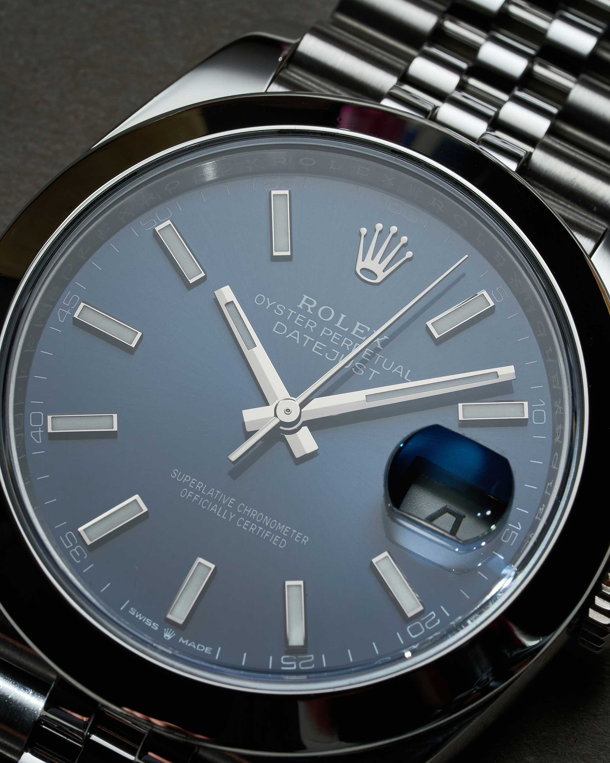 Rolex Datejust 41 mit blauem Zifferblatt, Strich Indexe, Jubilee-Band, glatt polierte Edelstahl Lünette, Box & Papiere aus 2021, Referenz 126300