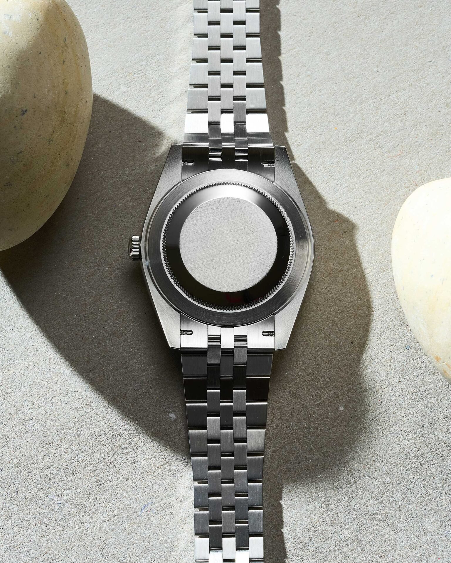 Die Rolex Datejust 41 126300 verfügt über ein 41-mm-Oyster-Gehäuse aus Edelstahl. Die glatt polierte Lünette ist ebenfalls aus Edelstahl gefertigt. Das Gehäuse ist mit Saphirglas ausgestattet und entspricht dem modernen Oyster-Aufbau mit verschraubter Krone.