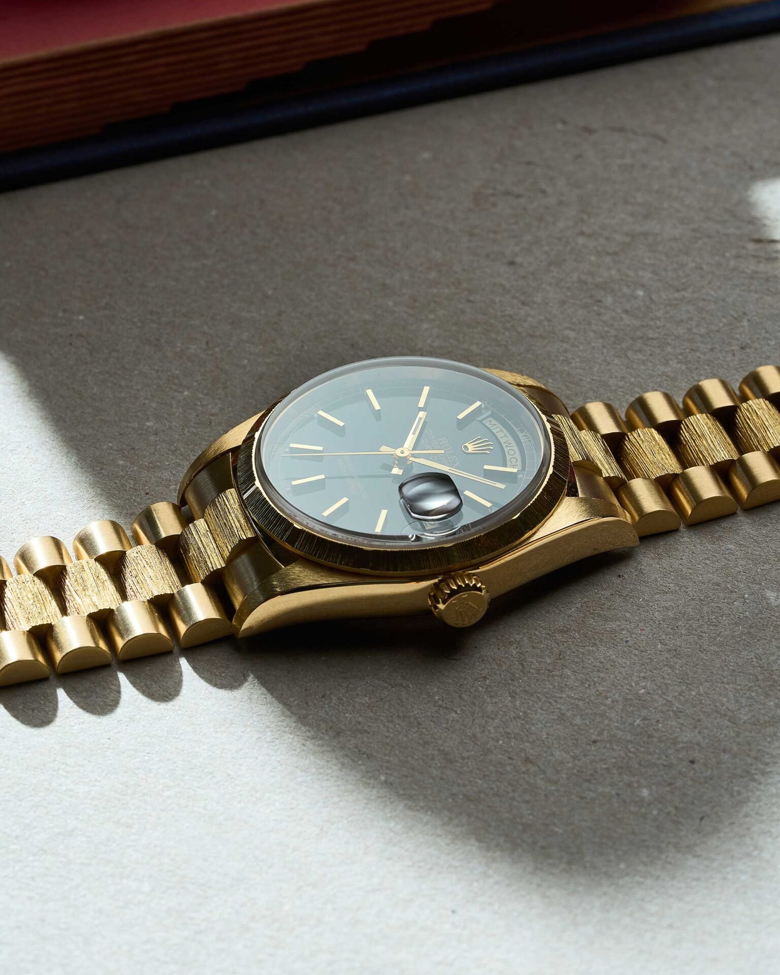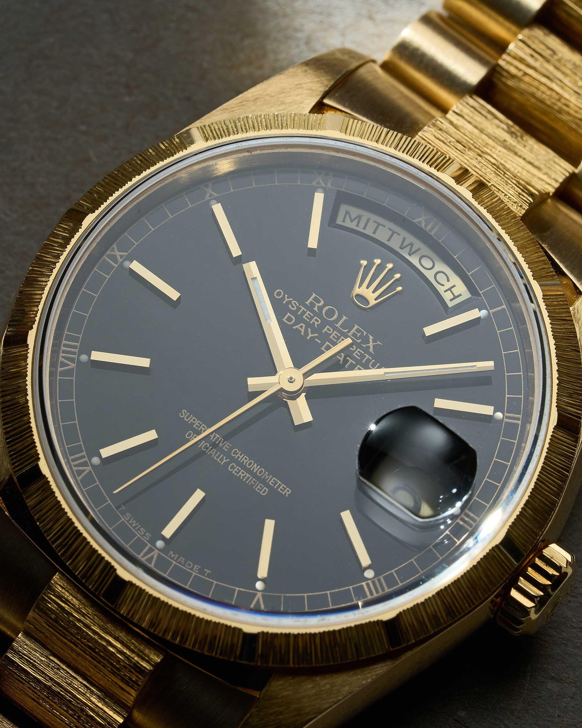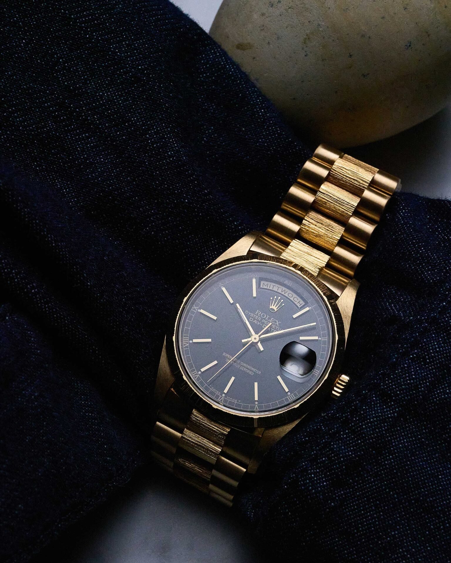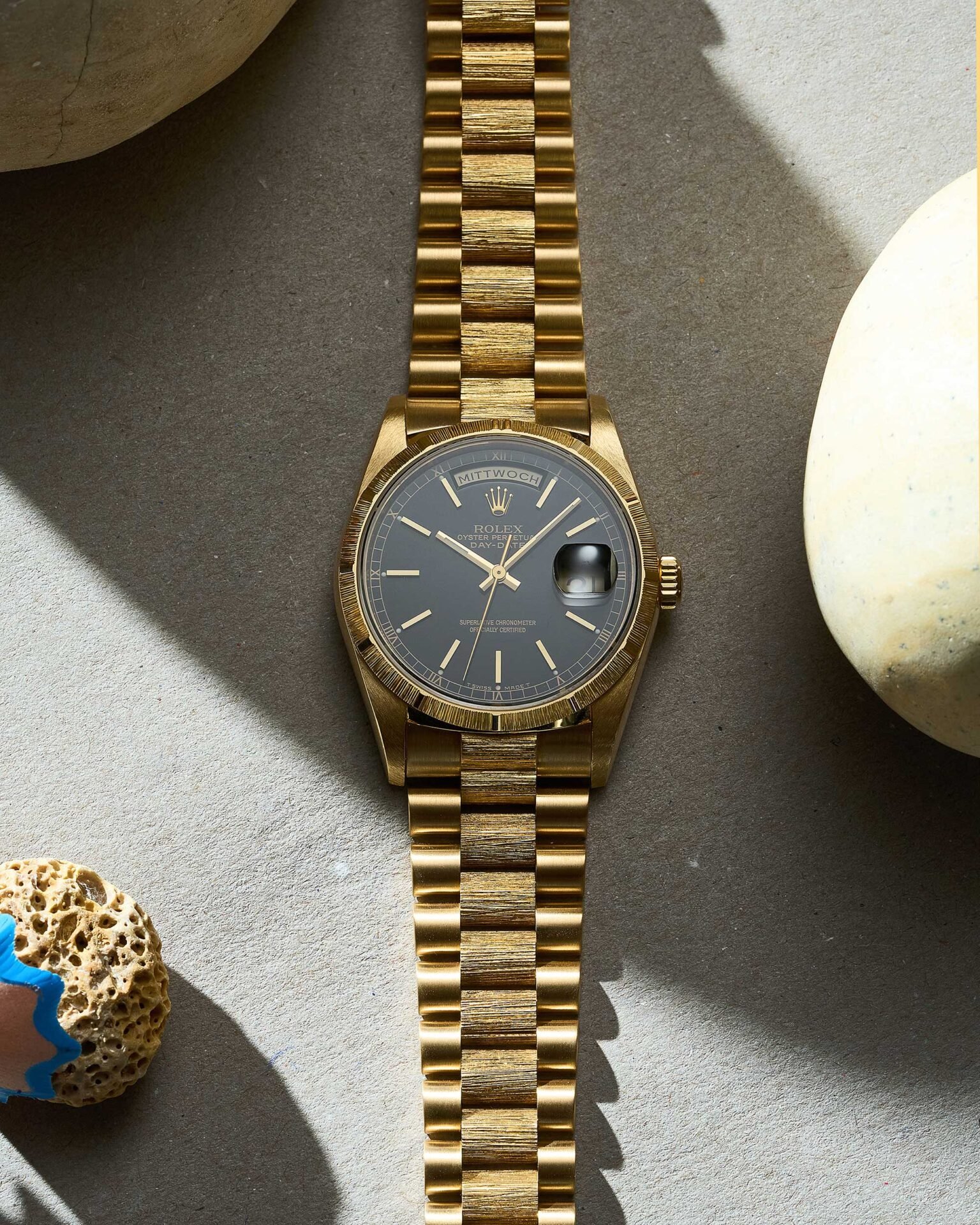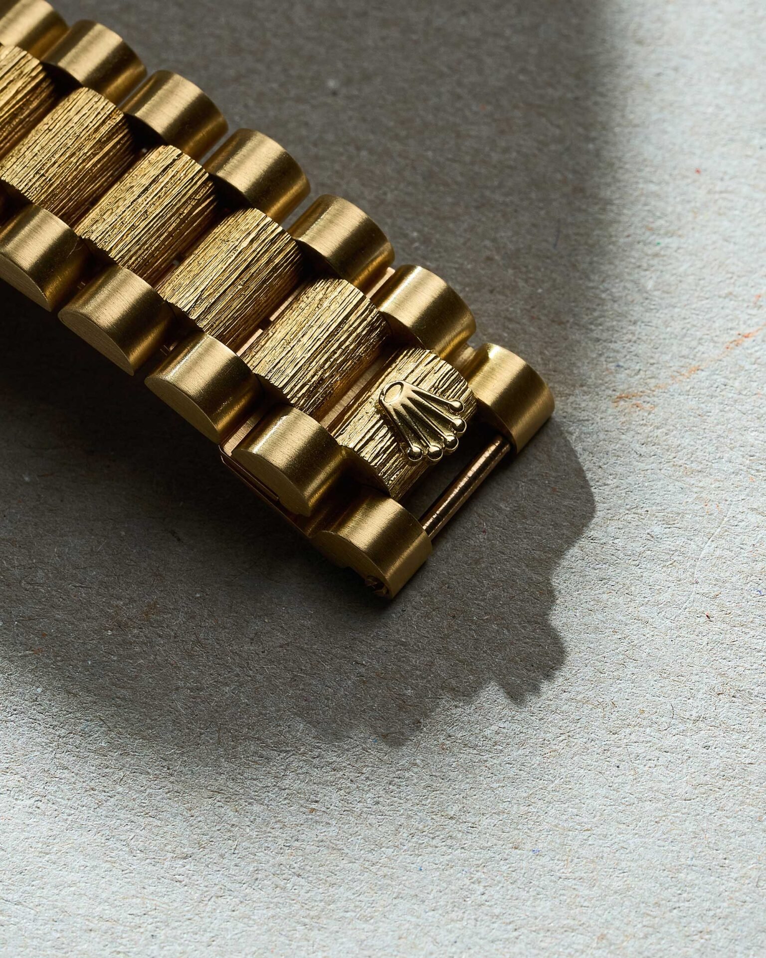 Ein besonderes Highlight dieser Uhr ist das Präsident-Band mit der seltenen und exquisiten Borke-Finish. Diese spezielle Textur verleiht der Uhr eine zusätzliche Dimension von Raffinesse und Exklusivität. Die Borke-Lünette ergänzt das Design des Bandes und verleiht der Uhr ein einheitliches und stilvolles Aussehen. Das Präsident-Band ist bekannt für seinen außergewöhnlichen Tragekomfort und seine Robustheit, und die verdeckte Crownclasp-Schließe sorgt für eine nahtlose Optik.