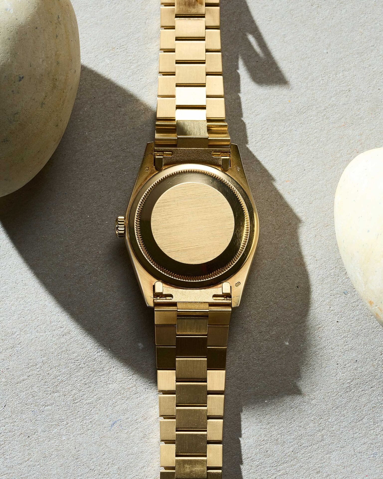Das Gehäuse der Rolex Day-Date Referenz 18248 besteht vollständig aus 18 Karat Gelbgold, was der Uhr ein eindrucksvolles und luxuriöses Erscheinungsbild verleiht. Mit einem Durchmesser von 36 mm bietet das Gehäuse eine klassische Größe, die sowohl an Herren- als auch an Damengelenken hervorragend zur Geltung kommt. Das schwarze Zifferblatt bildet einen scharfen Kontrast zum goldenen Gehäuse und den goldenen Indizes und Zeigern, was die Ablesbarkeit und Eleganz der Uhr unterstreicht. Die Tages- und Datumsanzeige, ein Markenzeichen der Day-Date-Serie, sind prominent bei 12 Uhr bzw. 3 Uhr positioniert.