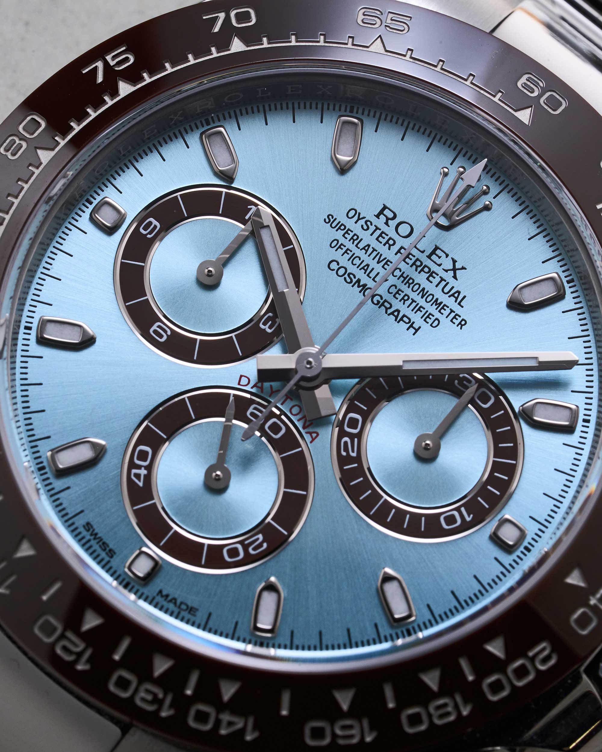 Das eisblaue Zifferblatt ist eine exklusive Designwahl für Rolex-Modelle aus Platin und verleiht dieser Daytona eine unverwechselbare Optik. Die braunen Totalisatoren ergänzen das Farbspiel der Lünette perfekt. Die typische Tri-Compax-Anordnung umfasst eine kleine Sekunde bei 6 Uhr, einen 30-Minuten-Zähler bei 3 Uhr und einen 12-Stunden-Zähler bei 9 Uhr – essenziell für den Chronographenbetrieb. Die Zeiger und Indizes sind mit Chromalight-Leuchtmasse beschichtet, um eine optimale Ablesbarkeit bei schlechten Lichtverhältnissen zu gewährleisten.