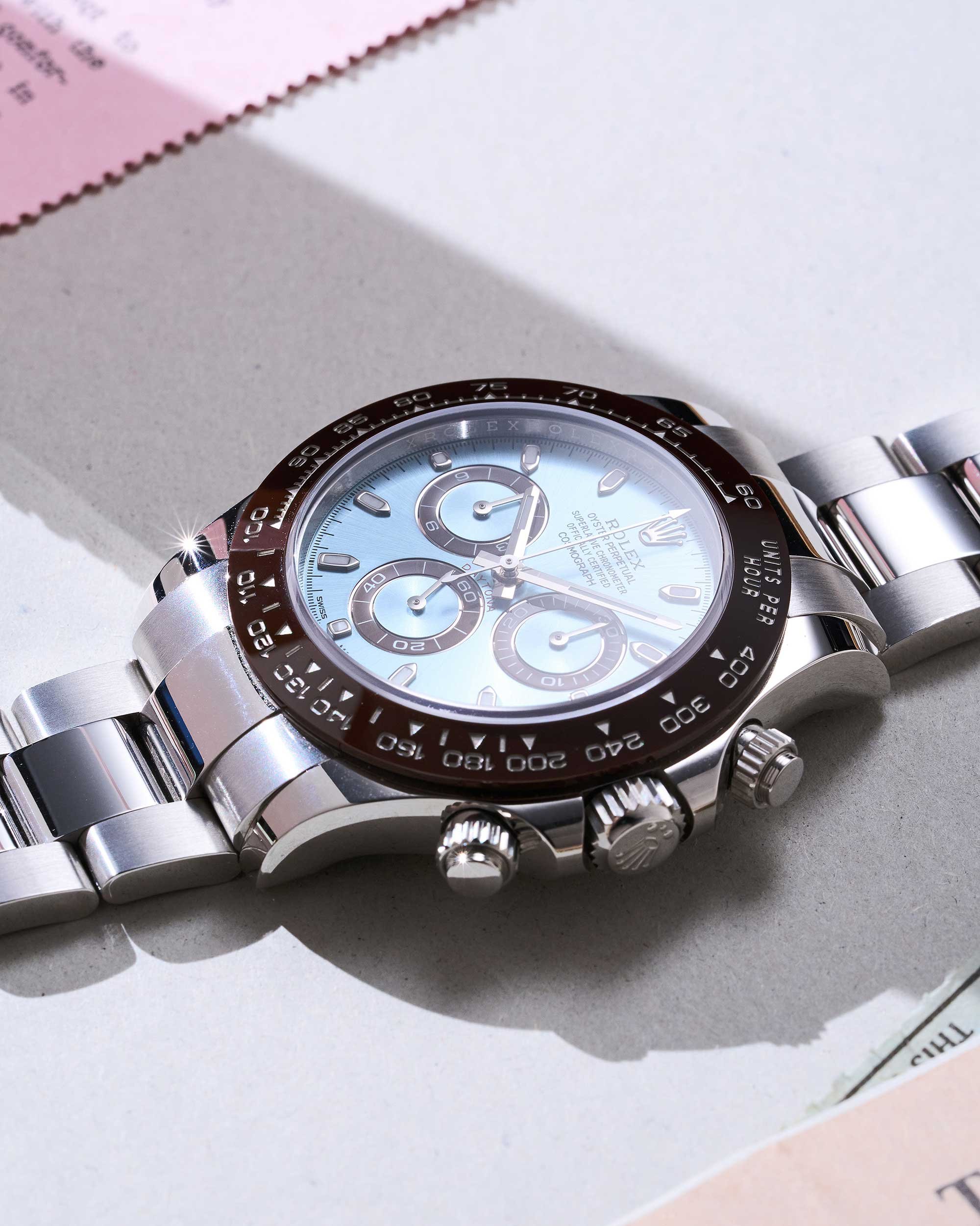 Rolex Daytona in Platin, Oyster-Band, eisblaues Zifferblatt, braune Cerachrom Keramiklünette, Box & Papiere aus 2022