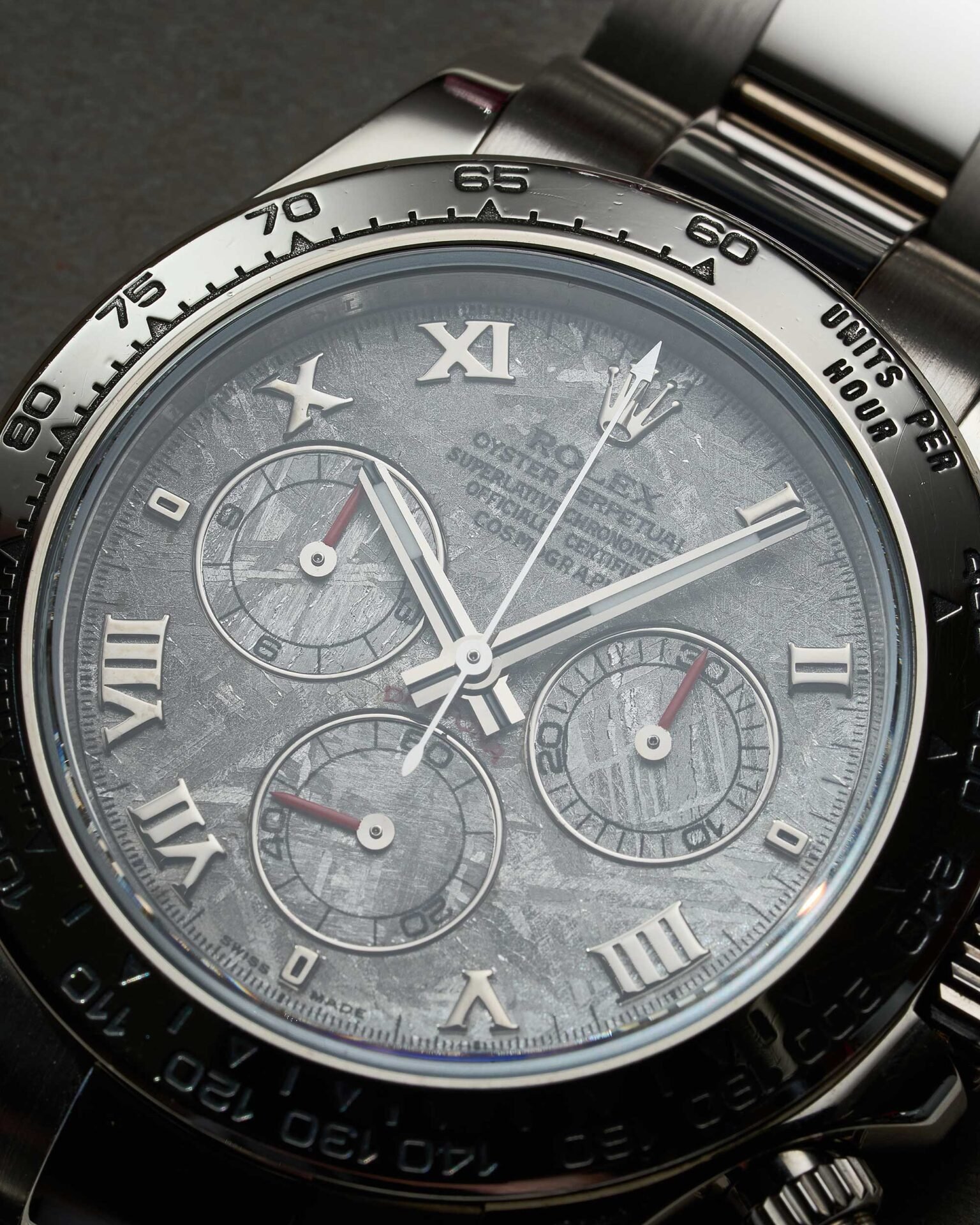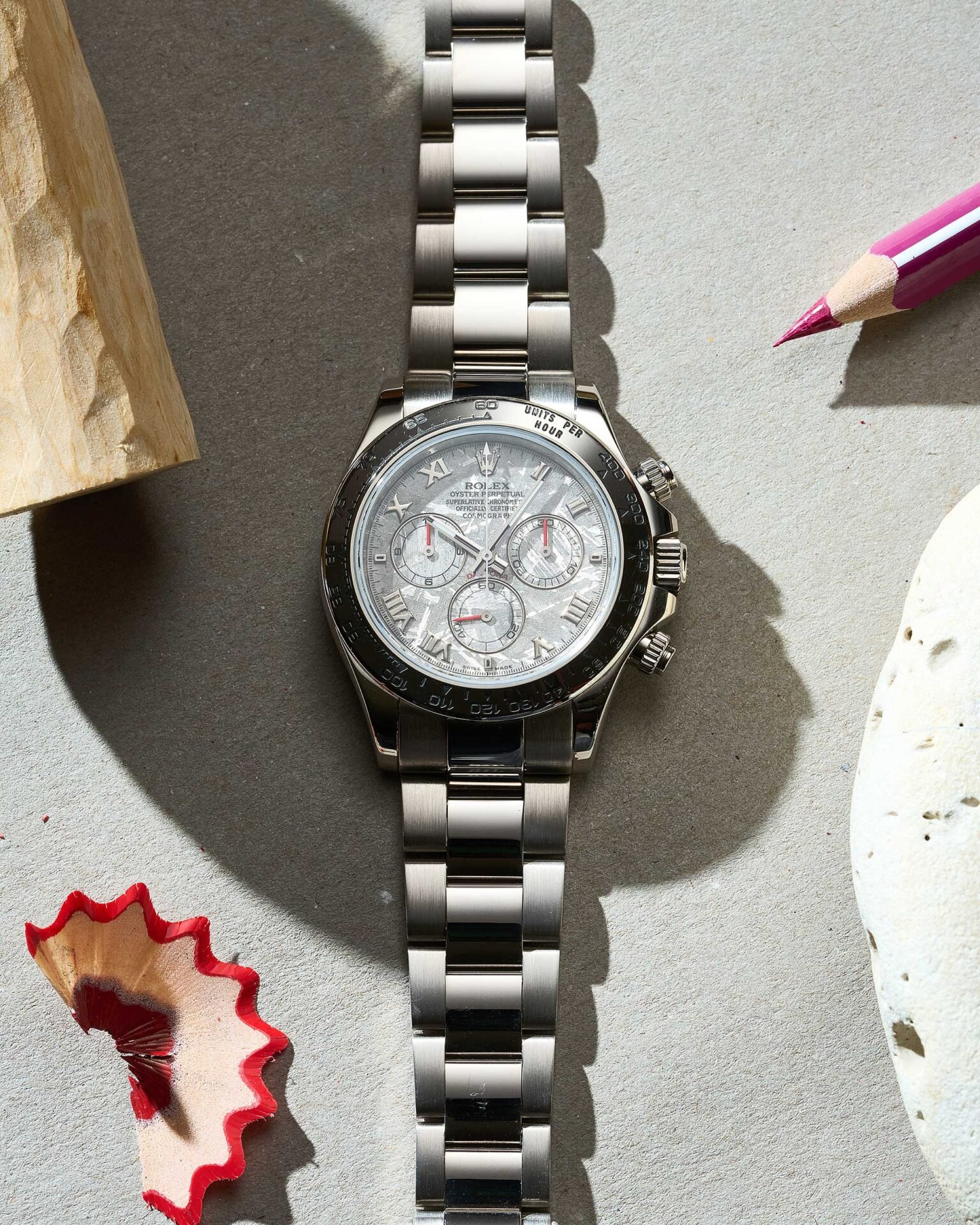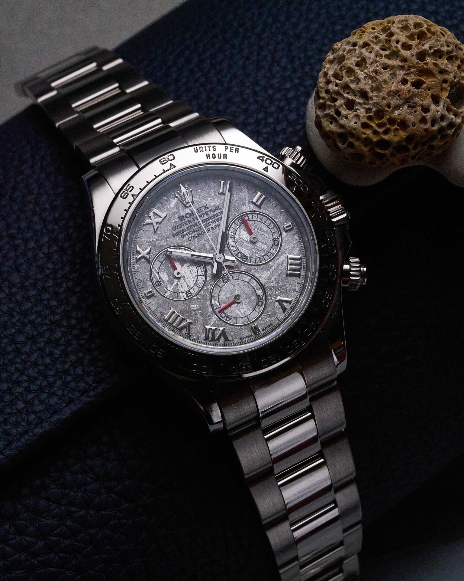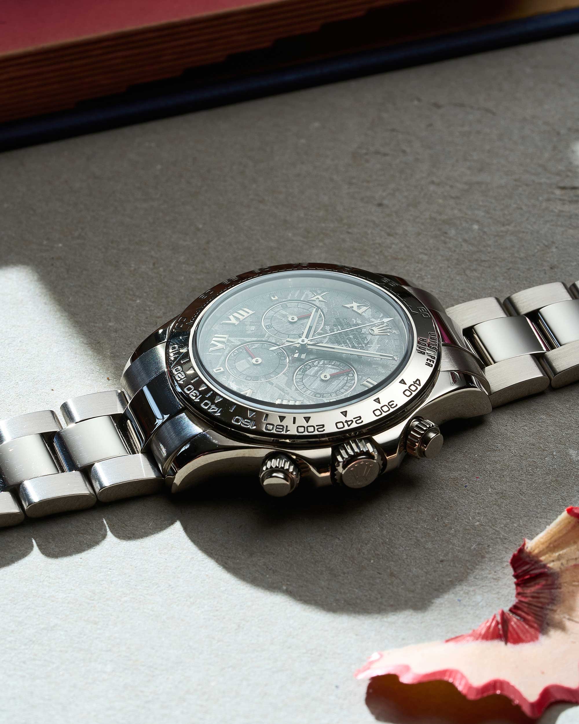 Die Referenz 116509 gehört zur Weißgold-Ausführung der Daytona-Serie. Varianten mit Meteoriten-Zifferblatt sind aufgrund des verwendeten Materials und der individuellen Struktur jedes Zifferblatts seltener innerhalb der Modellreihe. Modelle dieser Konfiguration verbinden Edelmetallgehäuse mit sportlicher Chronographenfunktion.
