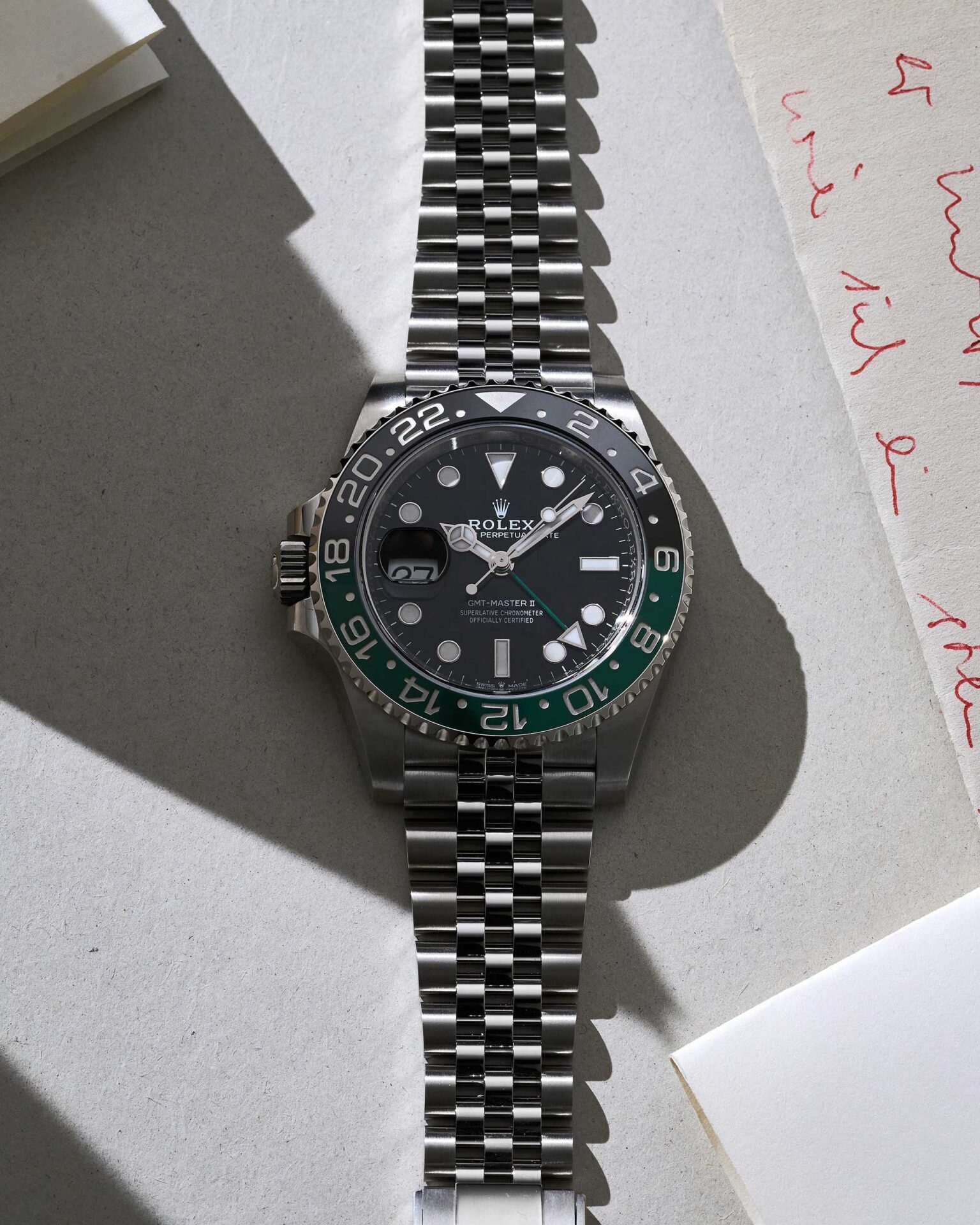 Diese GMT-Master II „Sprite“ stammt aus dem Jahr 2024 und wird inklusive originaler Rolex Box, Garantiekarte und kompletter Dokumentation angeboten. Die Uhr befindet sich in ausgezeichnetem Zustand mit nur minimalen Tragespuren.