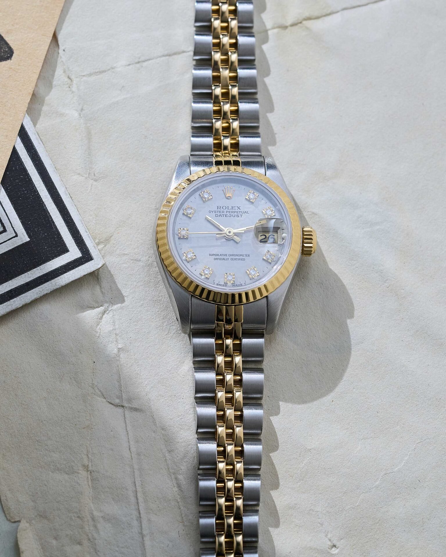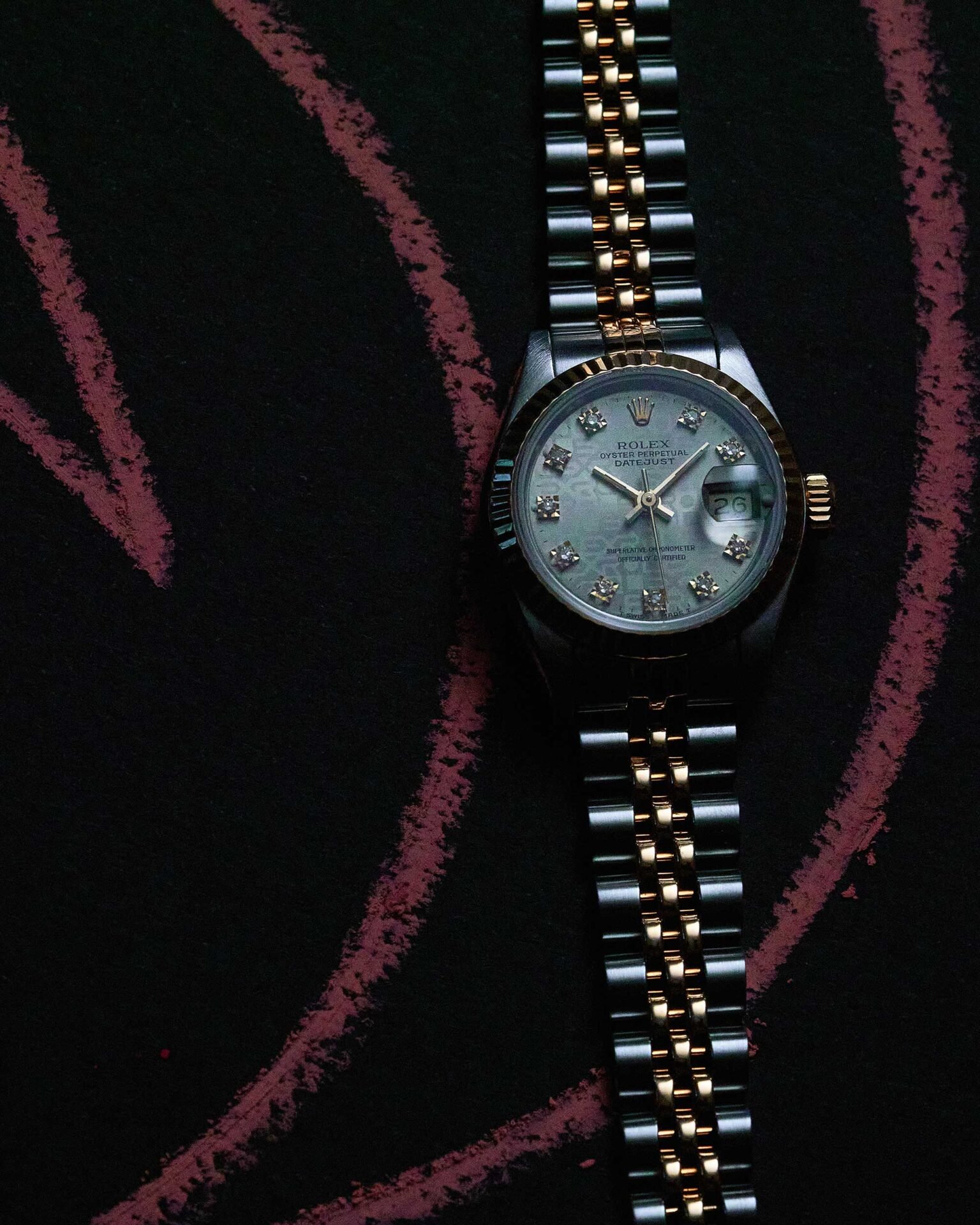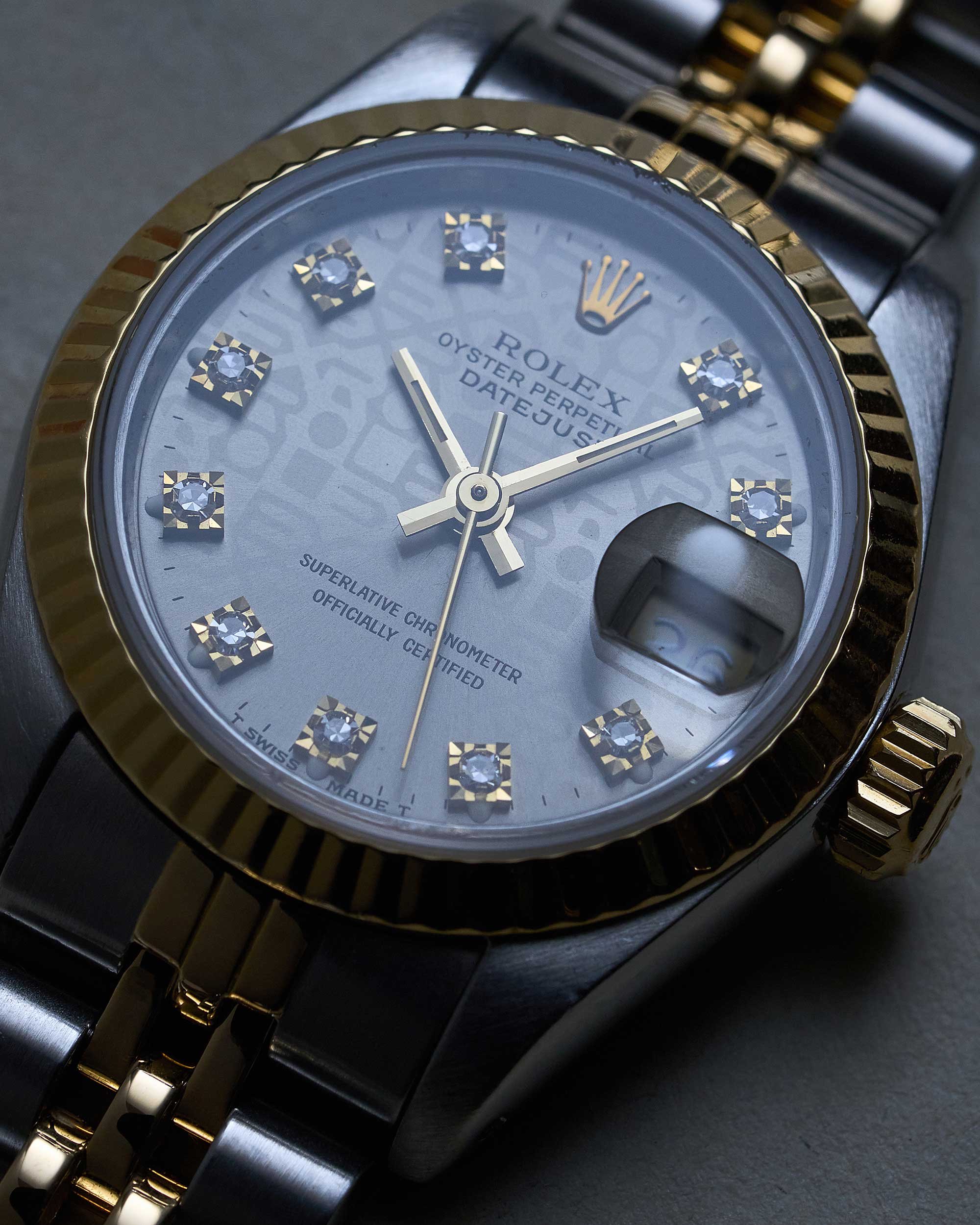 Das graue Jubilee-Diamant-Zifferblatt zeichnet sich durch seine strukturierte Oberfläche sowie original gesetzte Diamant-Stundenindizes aus. In Verbindung mit den goldenen Akzenten von Lünette, Krone und Zeigern entsteht ein harmonisches, luxuriöses Gesamtbild. Die Datumsanzeige bei 3 Uhr mit Zykloplupe ist das charakteristische Merkmal der Datejust-Linie.