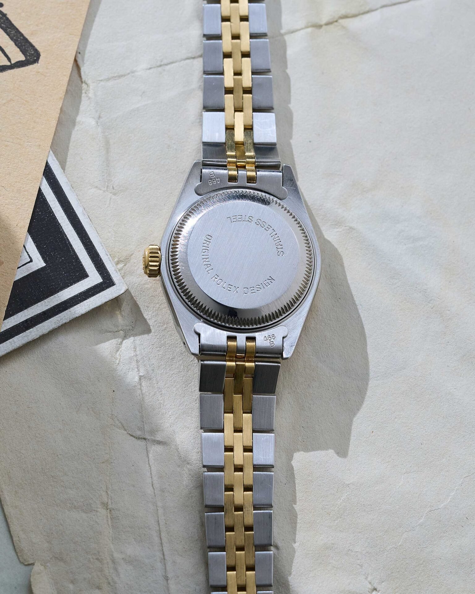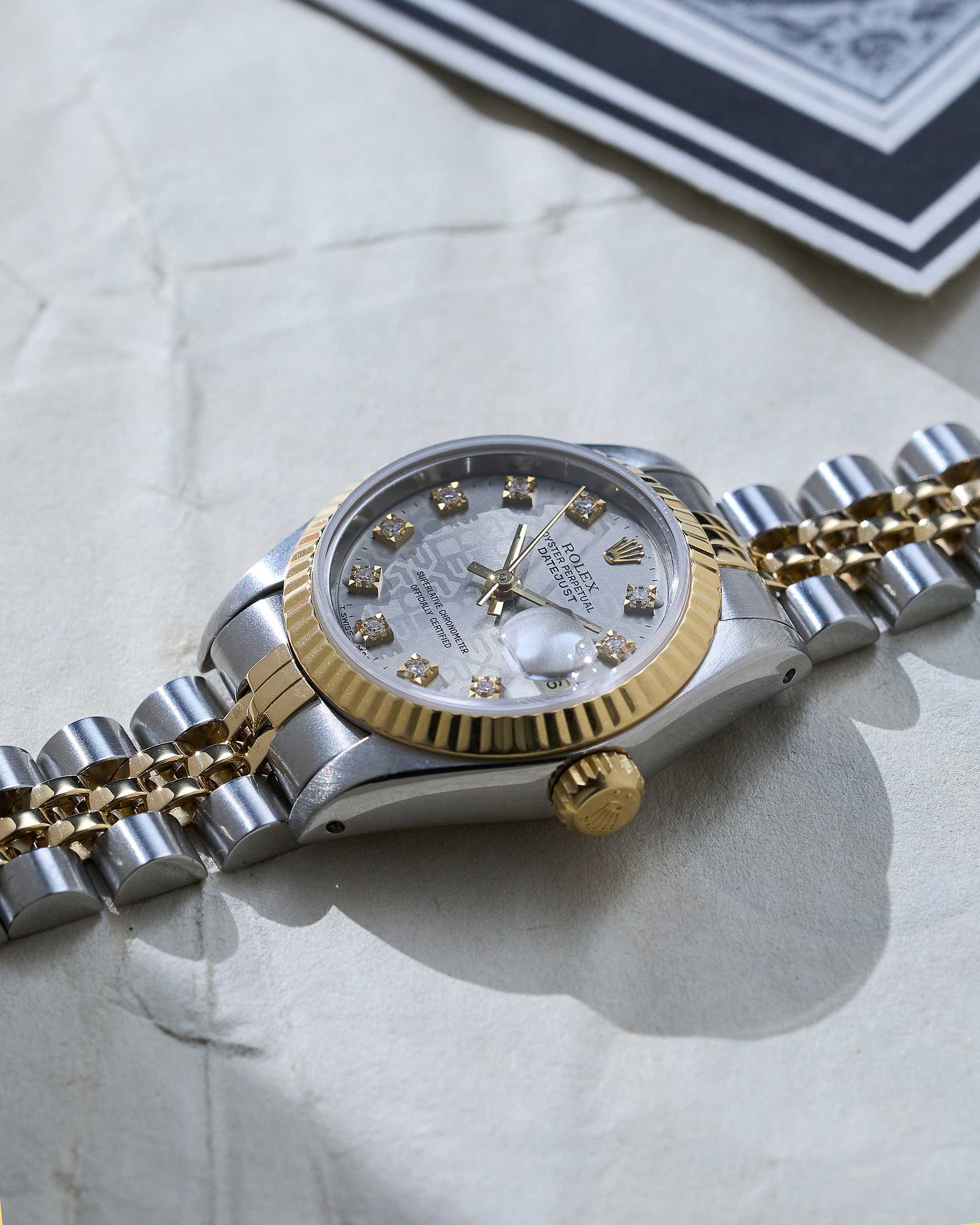 Die Rolex Lady-Datejust 69173 aus der R-Serie (ca. 1987) ist in klassischem Rolesor gefertigt – einer Kombination aus Edelstahl und 18 Karat Gelbgold. Das 26-mm-Oyster-Gehäuse wird von einer geriffelten Lünette aus Gelbgold gekrönt, die der Uhr ihre unverkennbare, elegante Ausstrahlung verleiht.