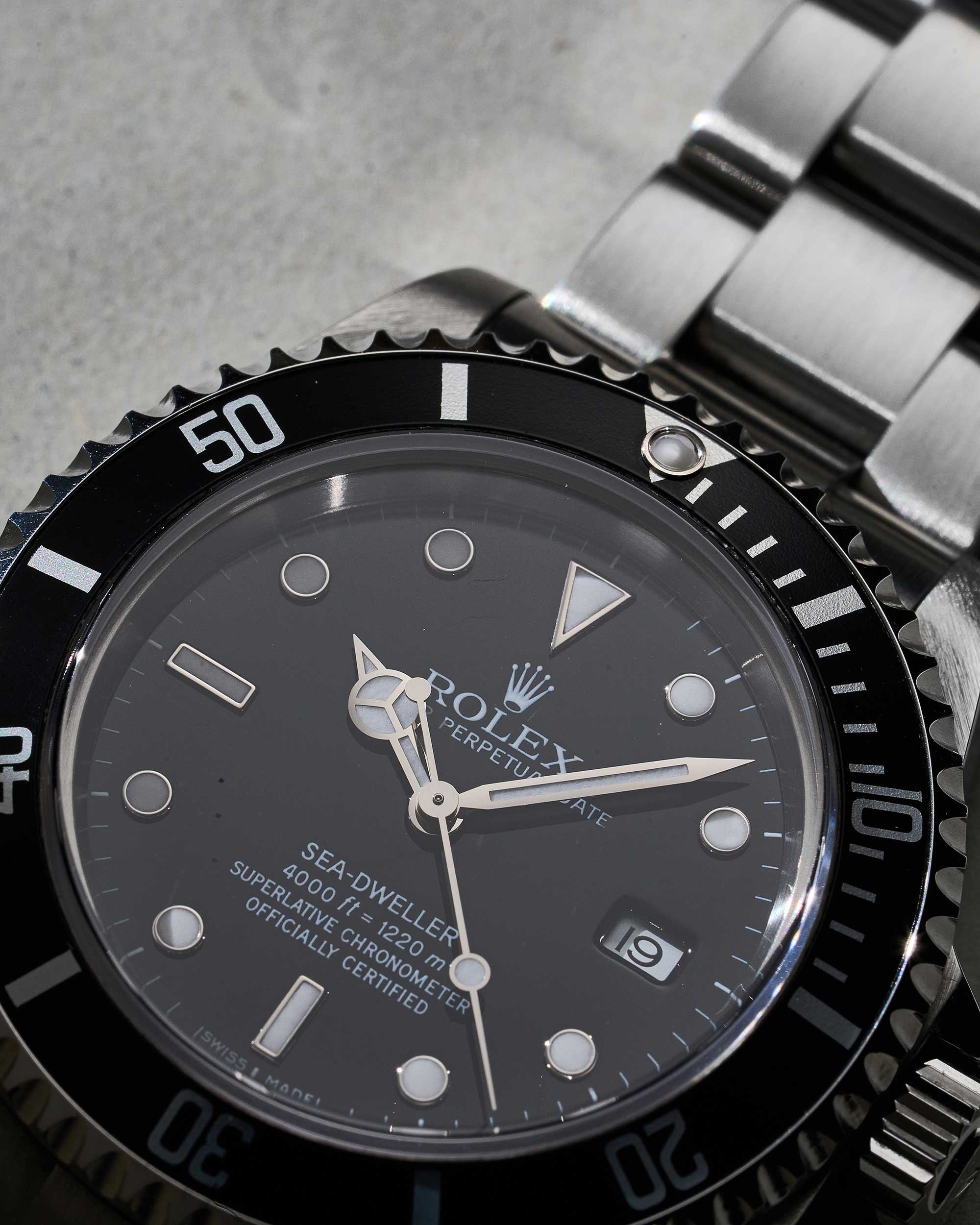 Das schwarze Zifferblatt ist klar strukturiert und bietet eine hervorragende Ablesbarkeit unter Wasser. Applizierte Leuchtindizes und -zeiger sorgen für optimale Sichtbarkeit auch bei schlechten Lichtverhältnissen. Das Datum bei 3 Uhr ist mit einer Cyclops-Lupe nicht vergrößert, im typischen Sea-Dweller-Stil.