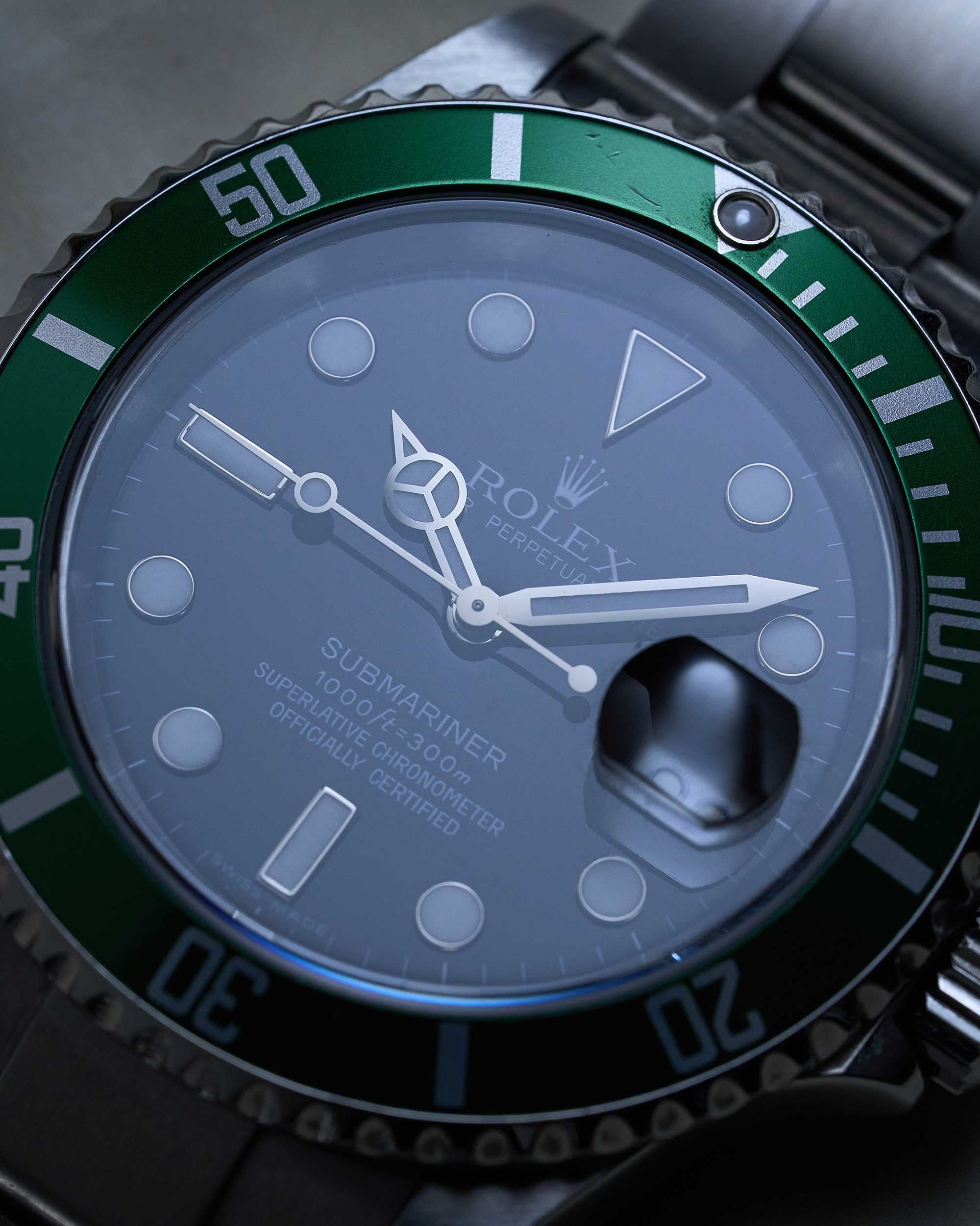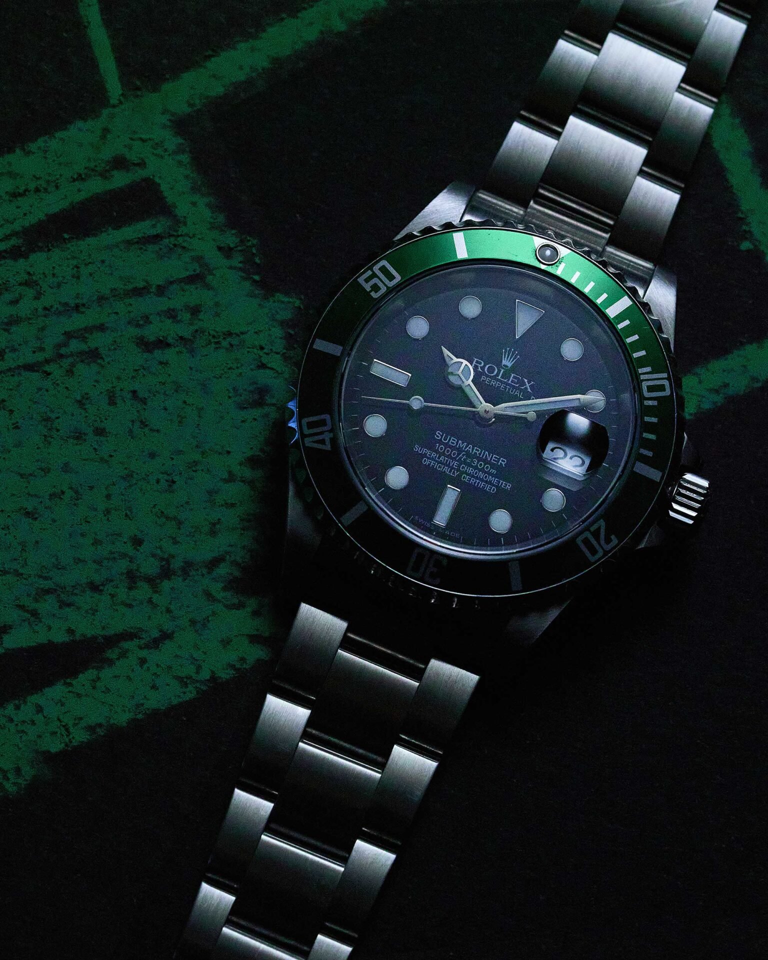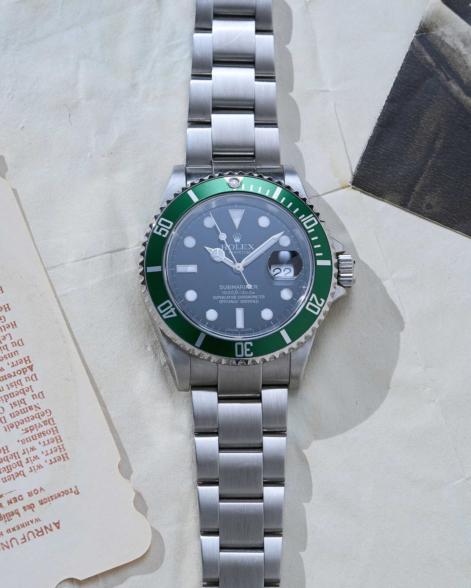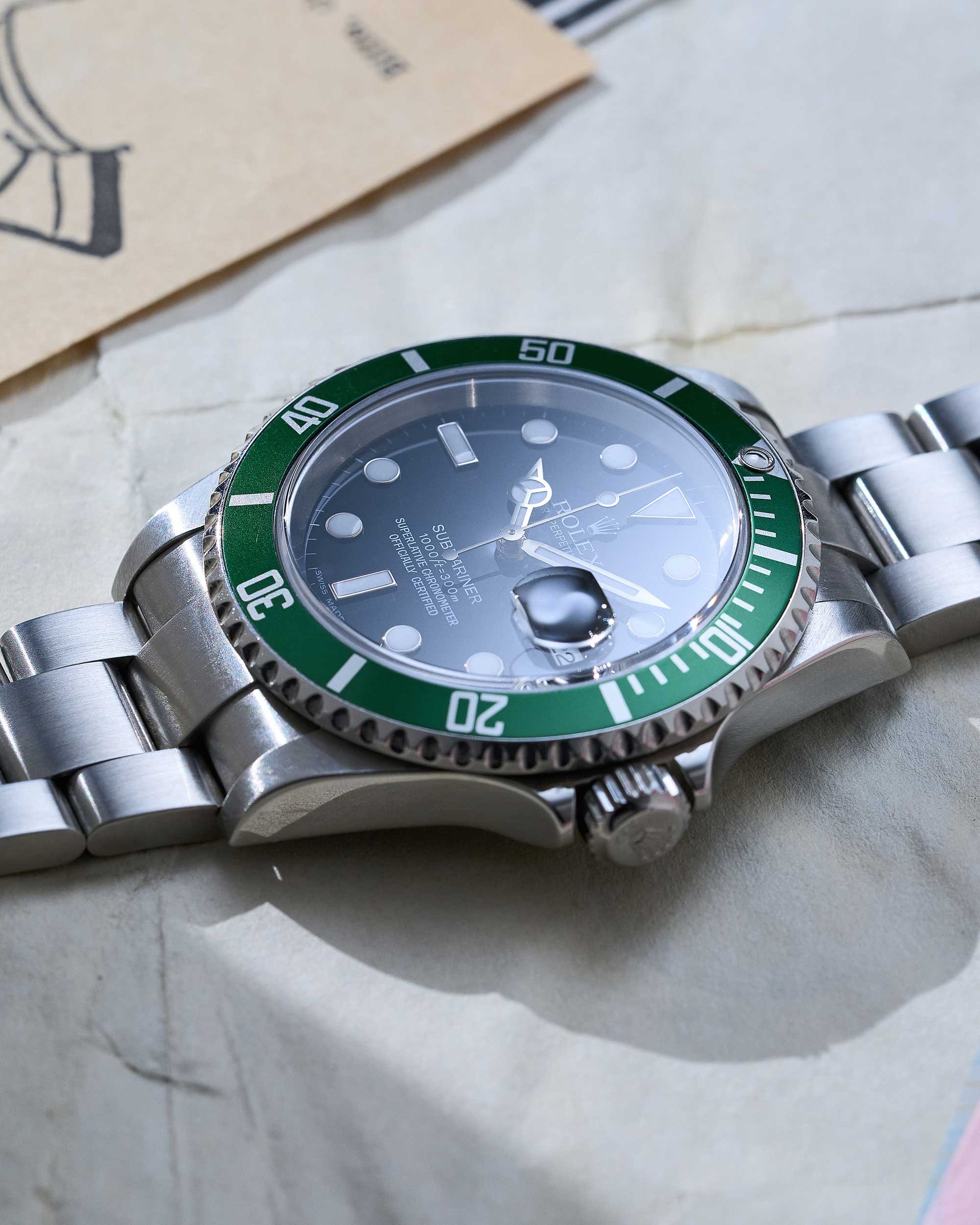 Die Referenz 16610LV wurde anlässlich des 50-jährigen Jubiläums der Submariner eingeführt und zählt zu den begehrten Sondervarianten dieser Modellreihe. Die grüne Lünette, die der Uhr den Beinamen „Kermit“ eingebracht hat, unterscheidet sie von den klassischen Submariner-Ausführungen. Die Produktion dieser Referenz endete, wodurch sie zunehmend Sammlerstatus erreicht.