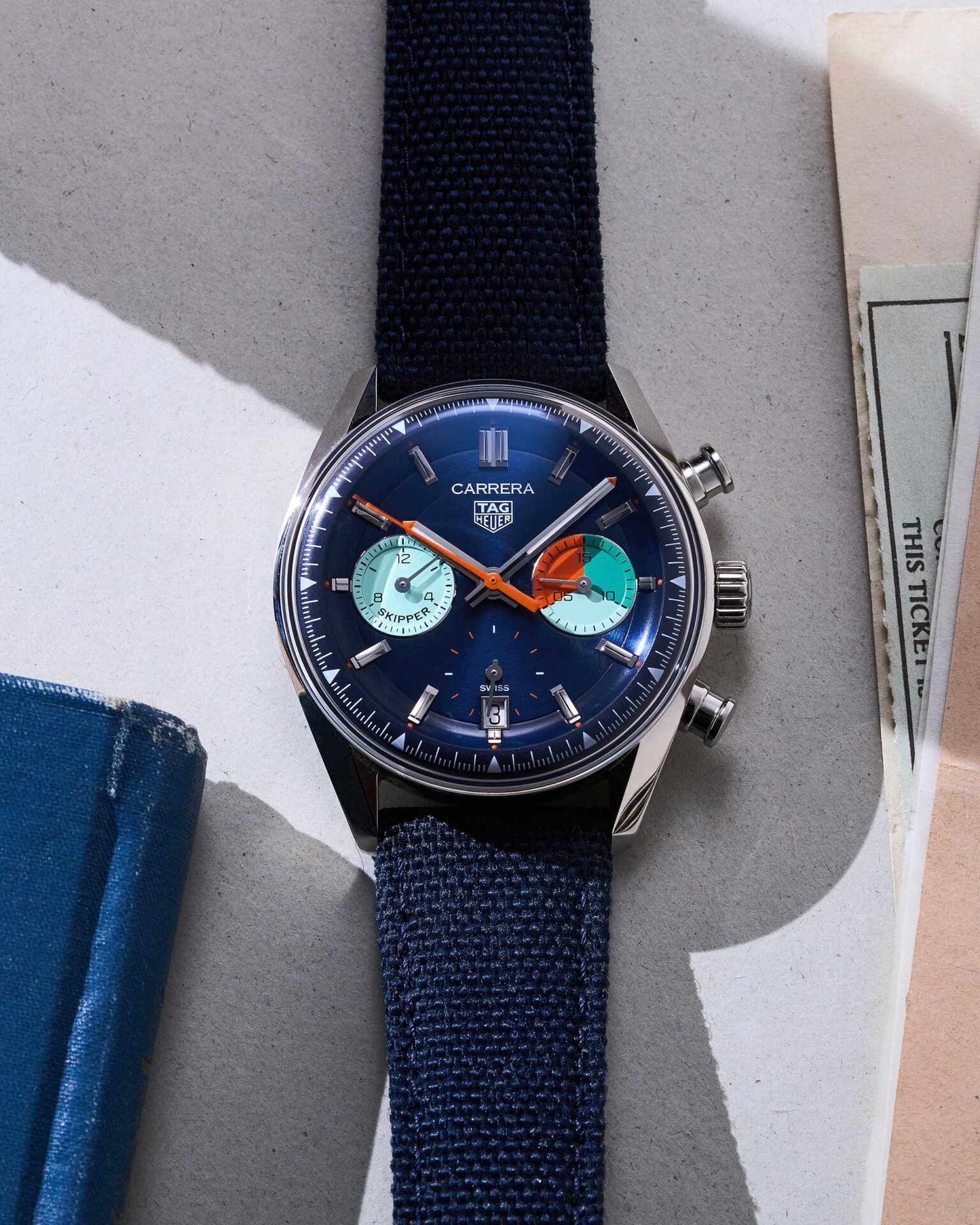 TAG Heuer Carrera Skipper Chronograph, blaues Zifferblatt, blaues Nylonarmband, Box & Papiere aus 2023