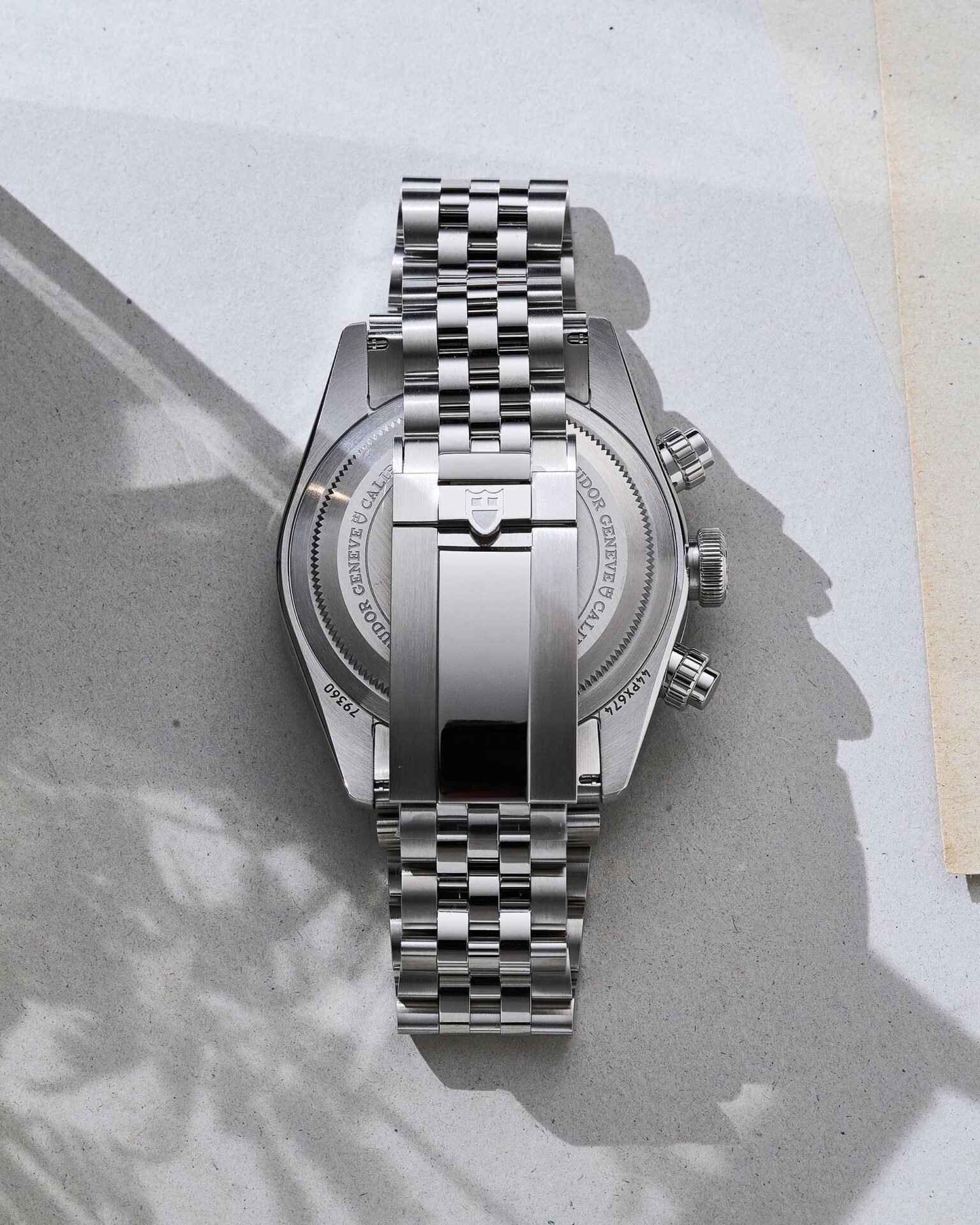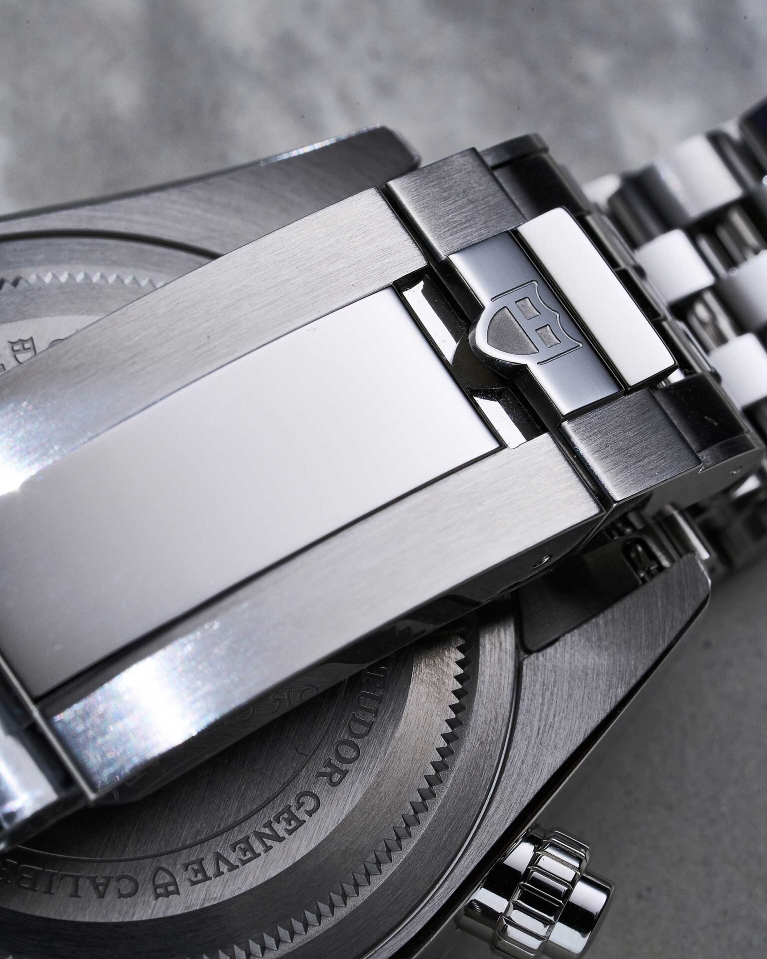 Die Uhr wird mit einem massiven Edelstahl-Oysterband geliefert, das sowohl satinierte als auch polierte Elemente kombiniert. Die Sicherheitsfaltschließe ist mit dem Tudor-Logo versehen und sorgt für perfekten Halt am Handgelenk.